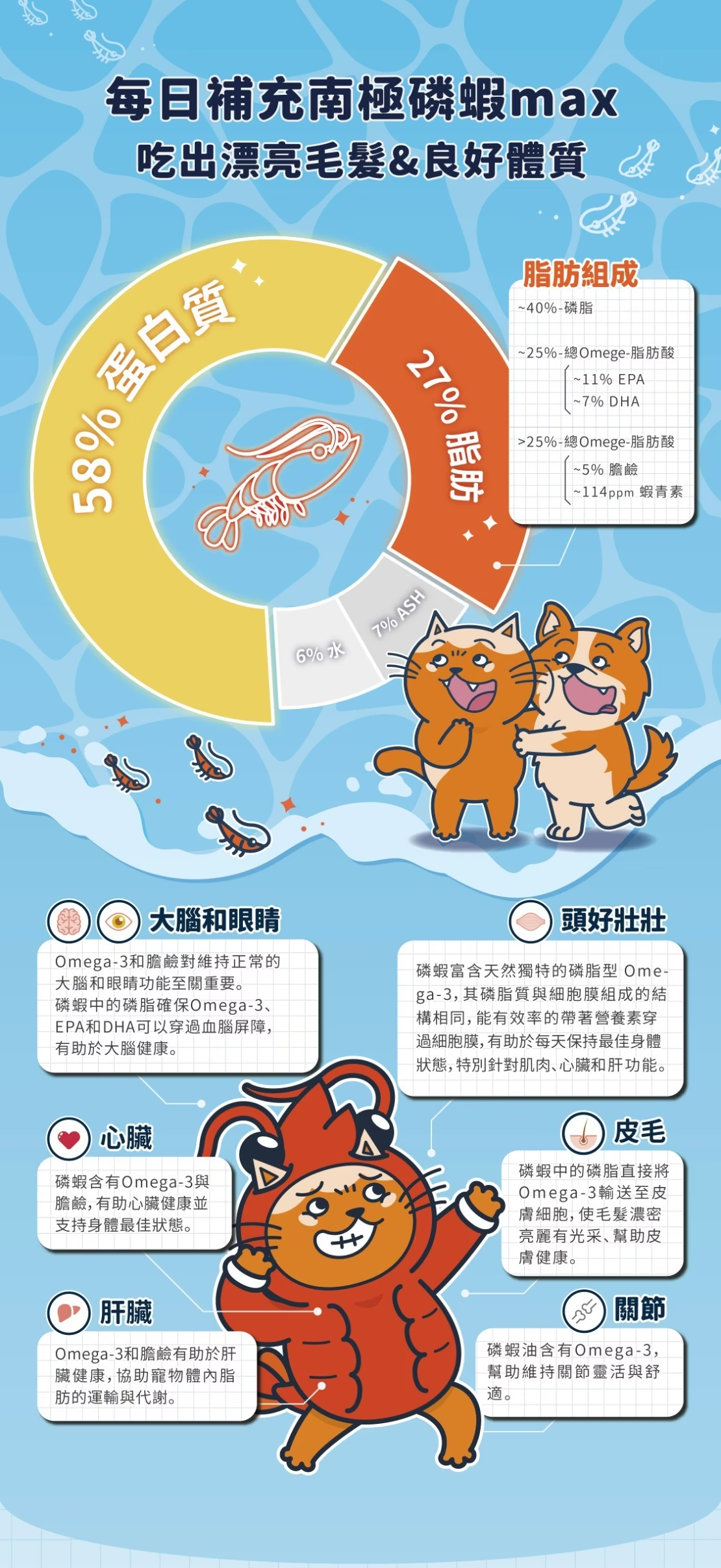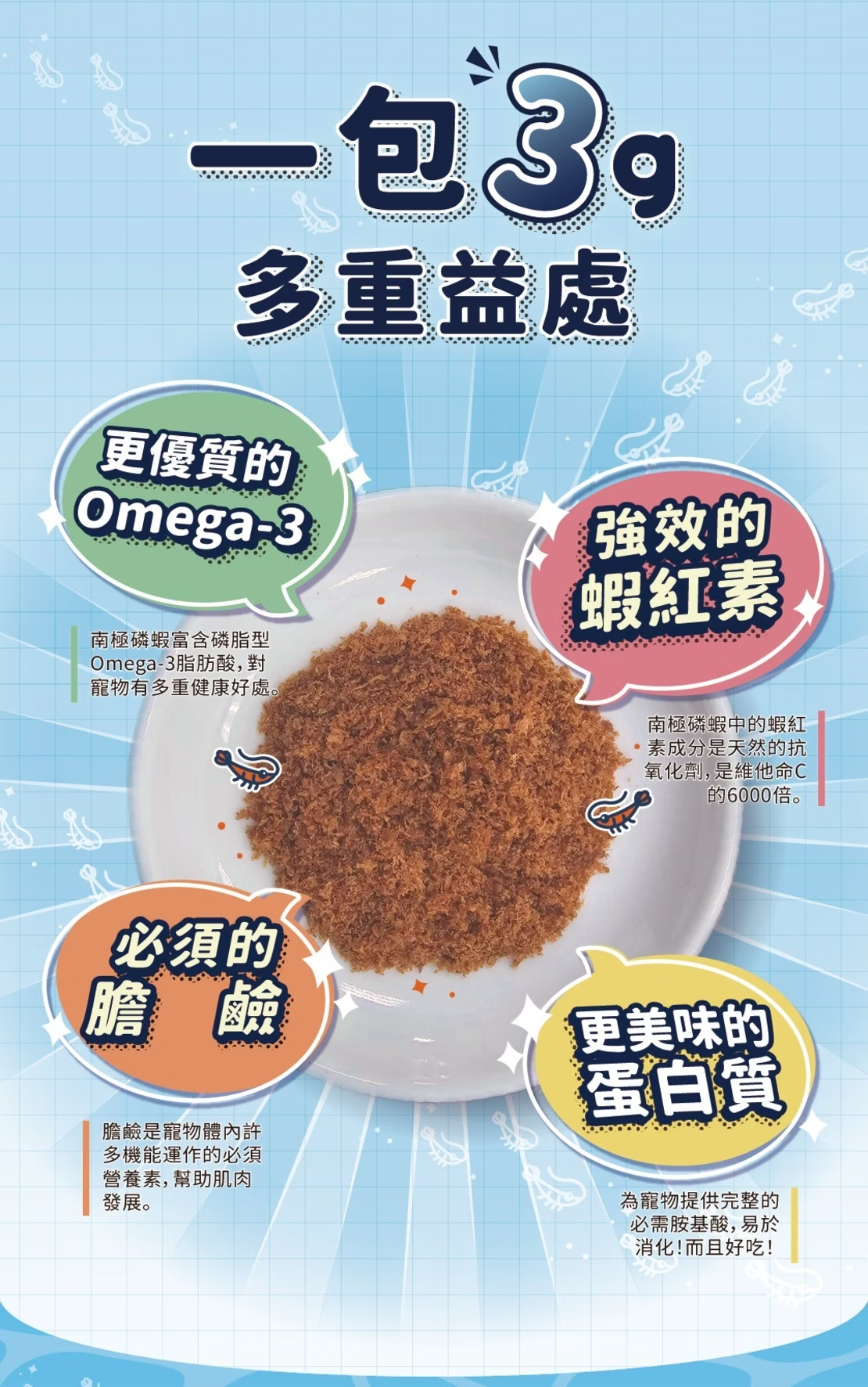 • 磷蝦粉是將整隻磷蝦乾燥後研磨成粉,主要成分是高含量蛋白質,保留了磷蝦中的多種營養成分
