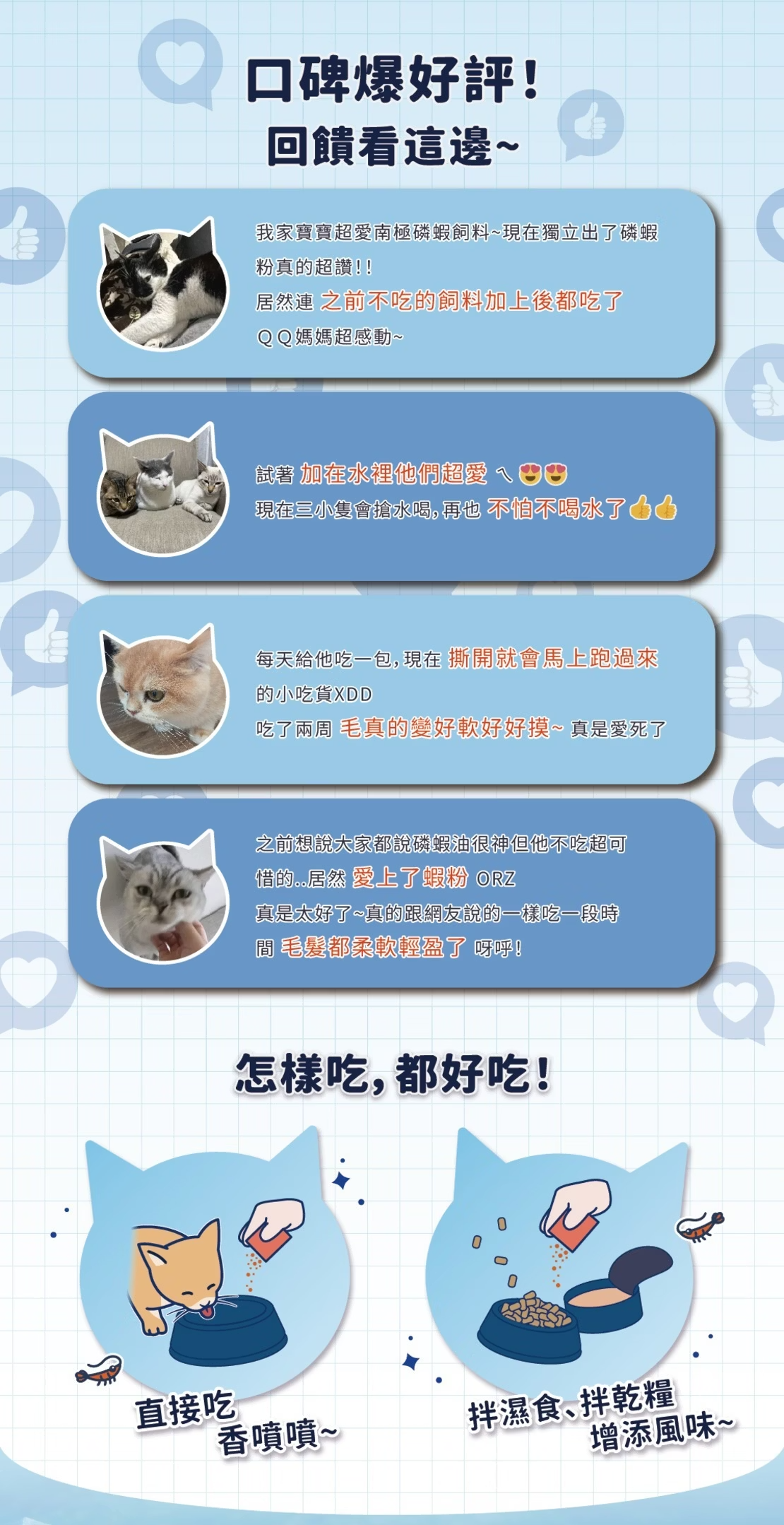 成貓每餐可搭配一包,一日請勿超過3包,多食無益