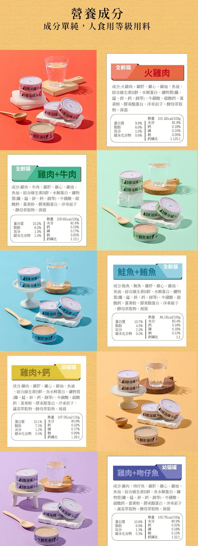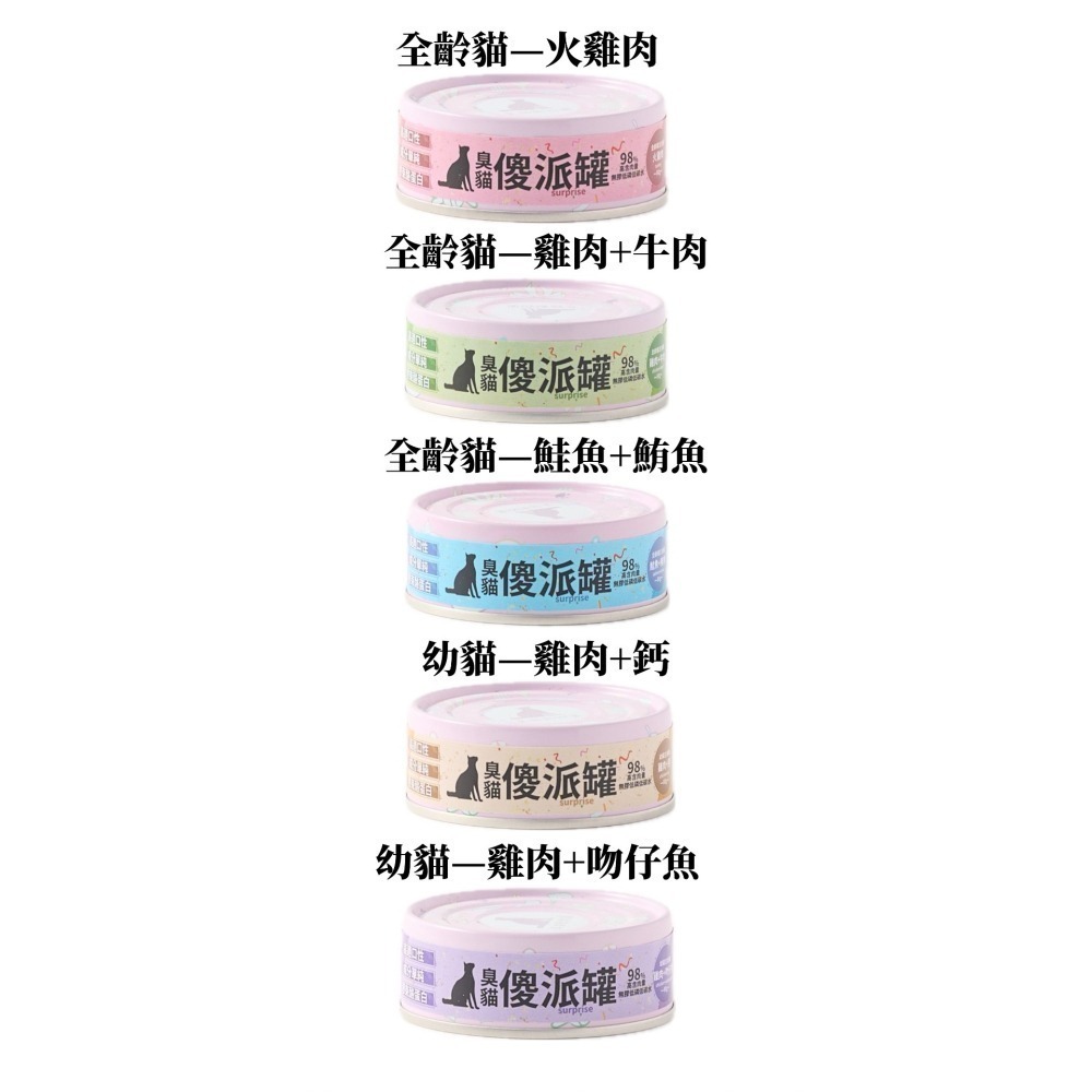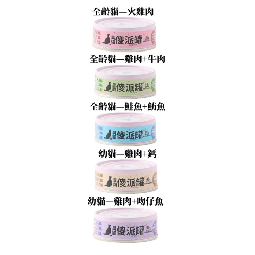 幼貓主食罐:幼貓需要更高的蛋白質、維生素與礦物質比例,傻派特別推出「雞肉+鈣」與「雞肉+吻仔魚」兩種幼貓罐頭口味,以滿足成長所需的全面營養。
