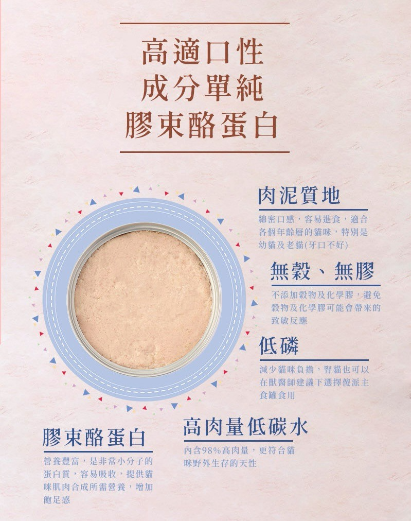 挑嘴貓罐頭:傻派主食罐的泥狀質地更容易被挑食的貓咪接受,並且含有充足的油脂與天然鮮肉香氣;膠束酪蛋白的加入進一步提升適口性。