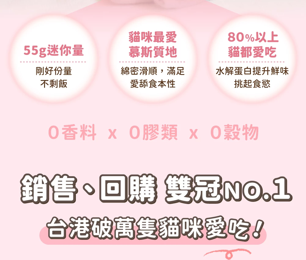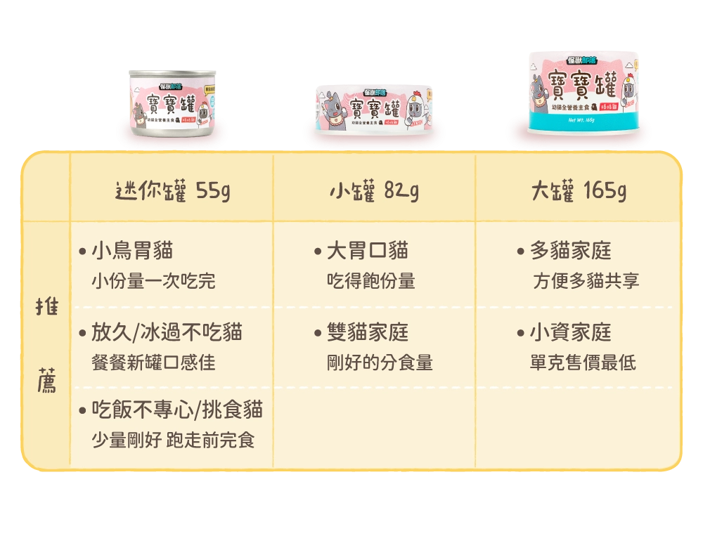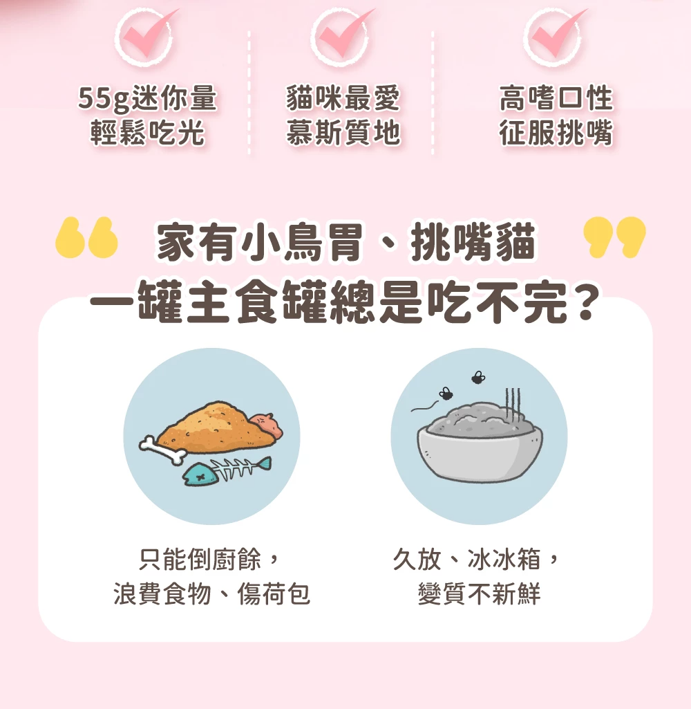 55g迷你罐:適合食量小、吃飯不專心或挑嘴的貓咪;也推薦給怕食物放久或冰過就不吃的小怪獸。
