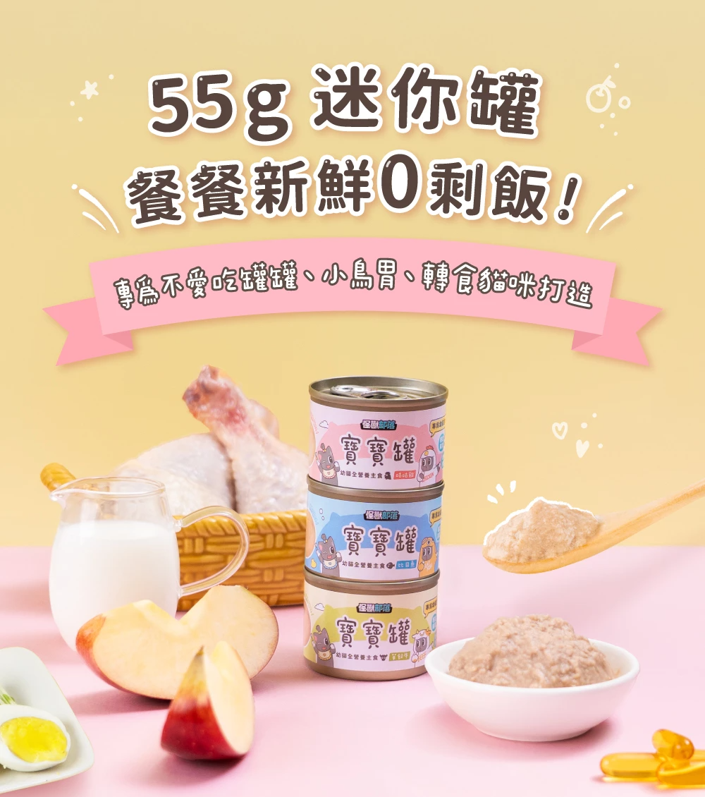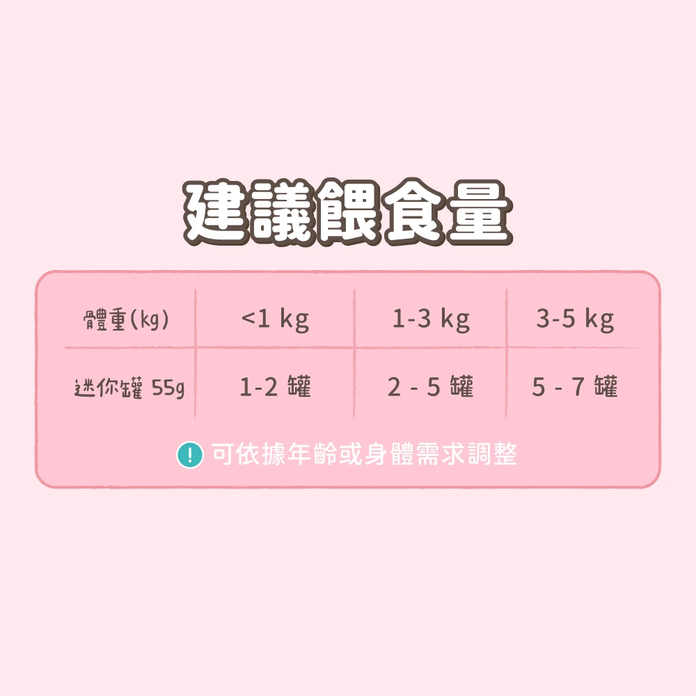 55g迷你罐專為食量小、吃飯不專心、挑嘴小怪獸設計,可有足夠飽足感並能餐餐吃完,避免久放變質、冰過影響嗜口性。