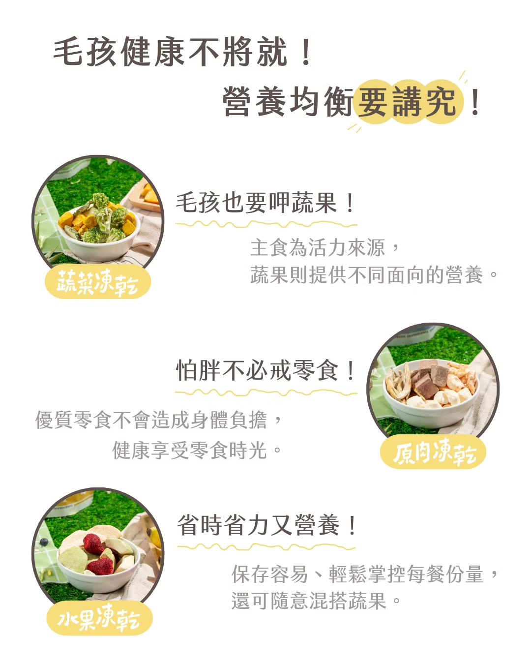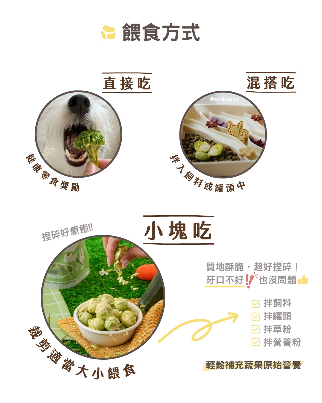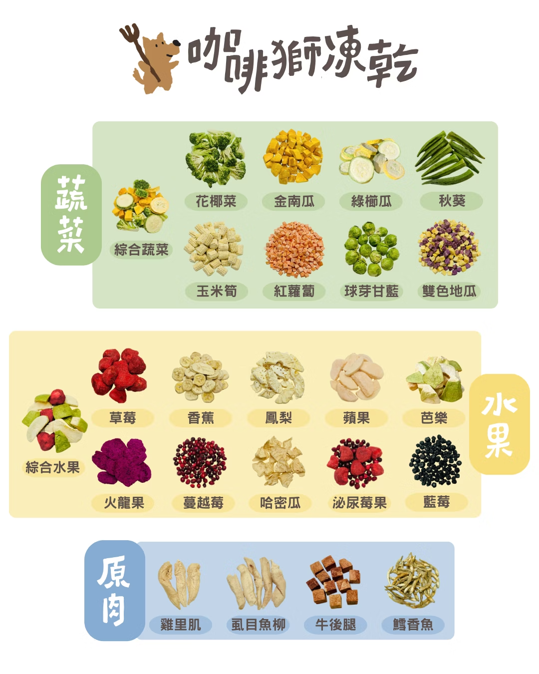 - 綜合蔬菜凍乾 →金南瓜、花椰菜、綠櫛瓜(零添加物)