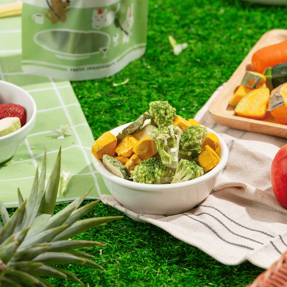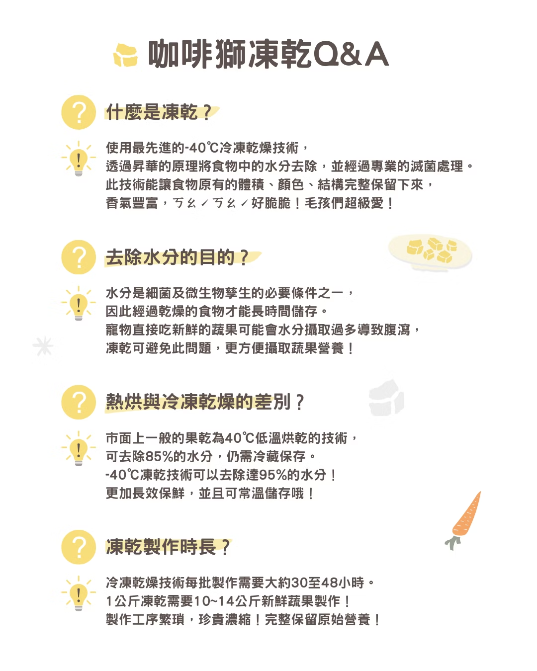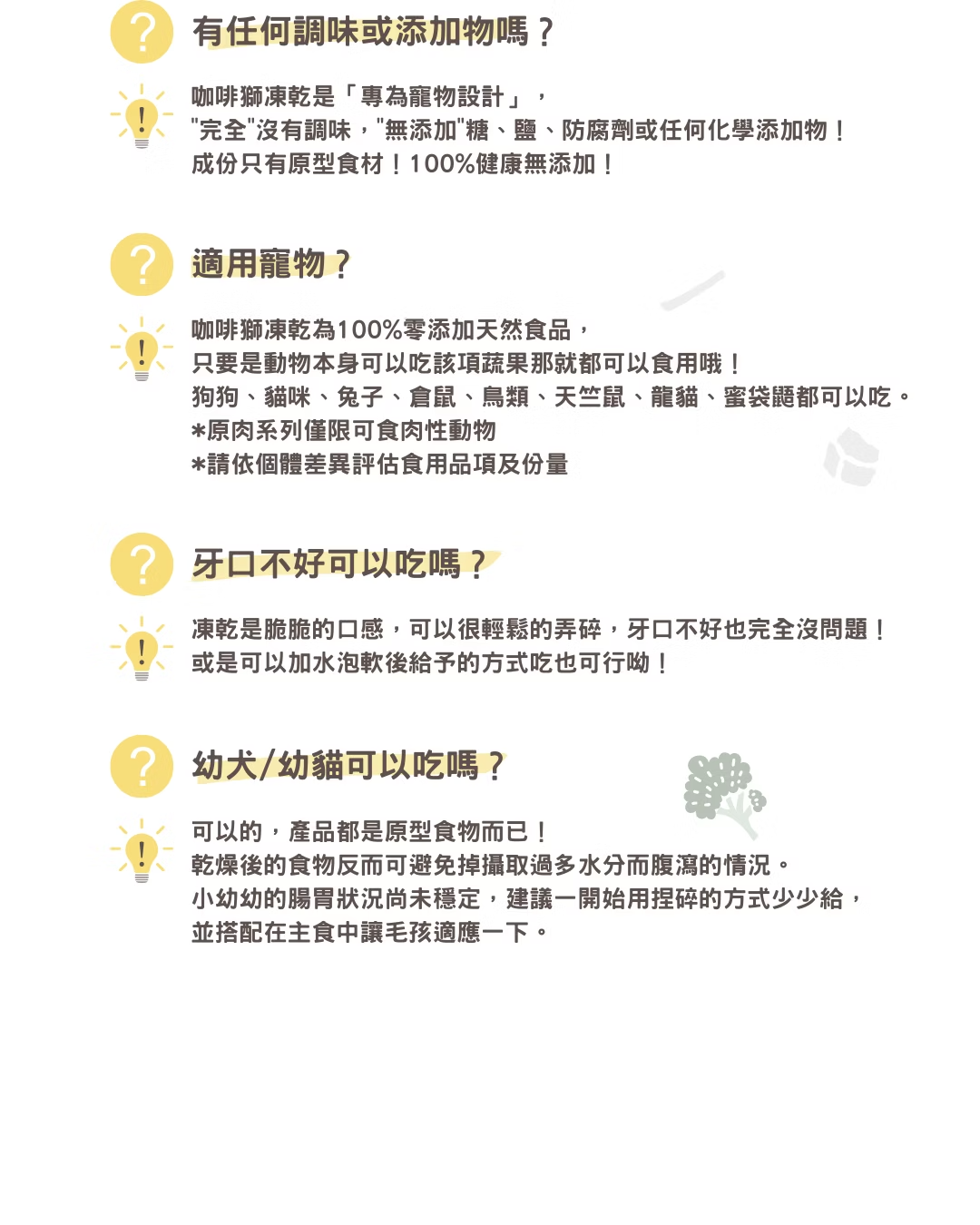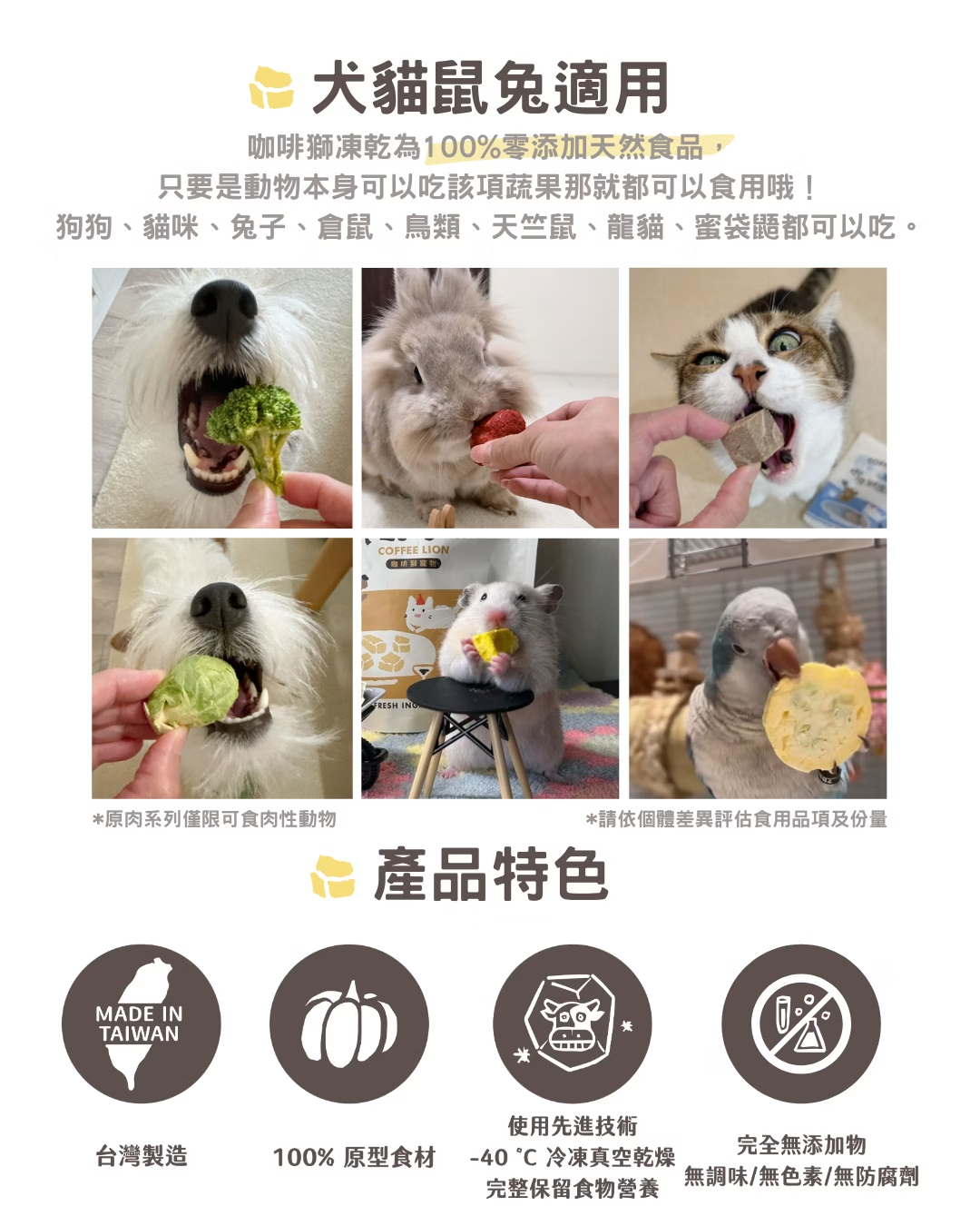 - 綜合蔬菜凍乾 →金南瓜、花椰菜、綠櫛瓜(零添加物)
