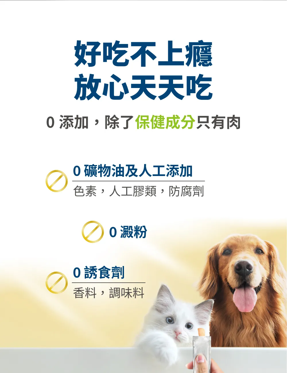 保健肉泥保證不添加任何加工食品,絕不含防腐劑、誘食劑、香精、人工色素等,對毛孩有害的添加物。肉泥嗜口性來自長達2年的技術開發,透過天然水解、選用純肉及內臟、高速研磨等高端技術,結合寵物嗜口性研究,才有辦法製成符合毛孩習性、愛吃的風味。