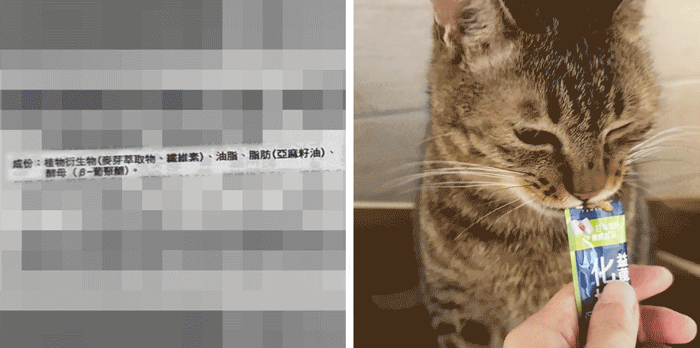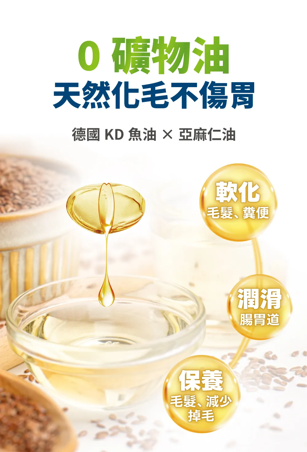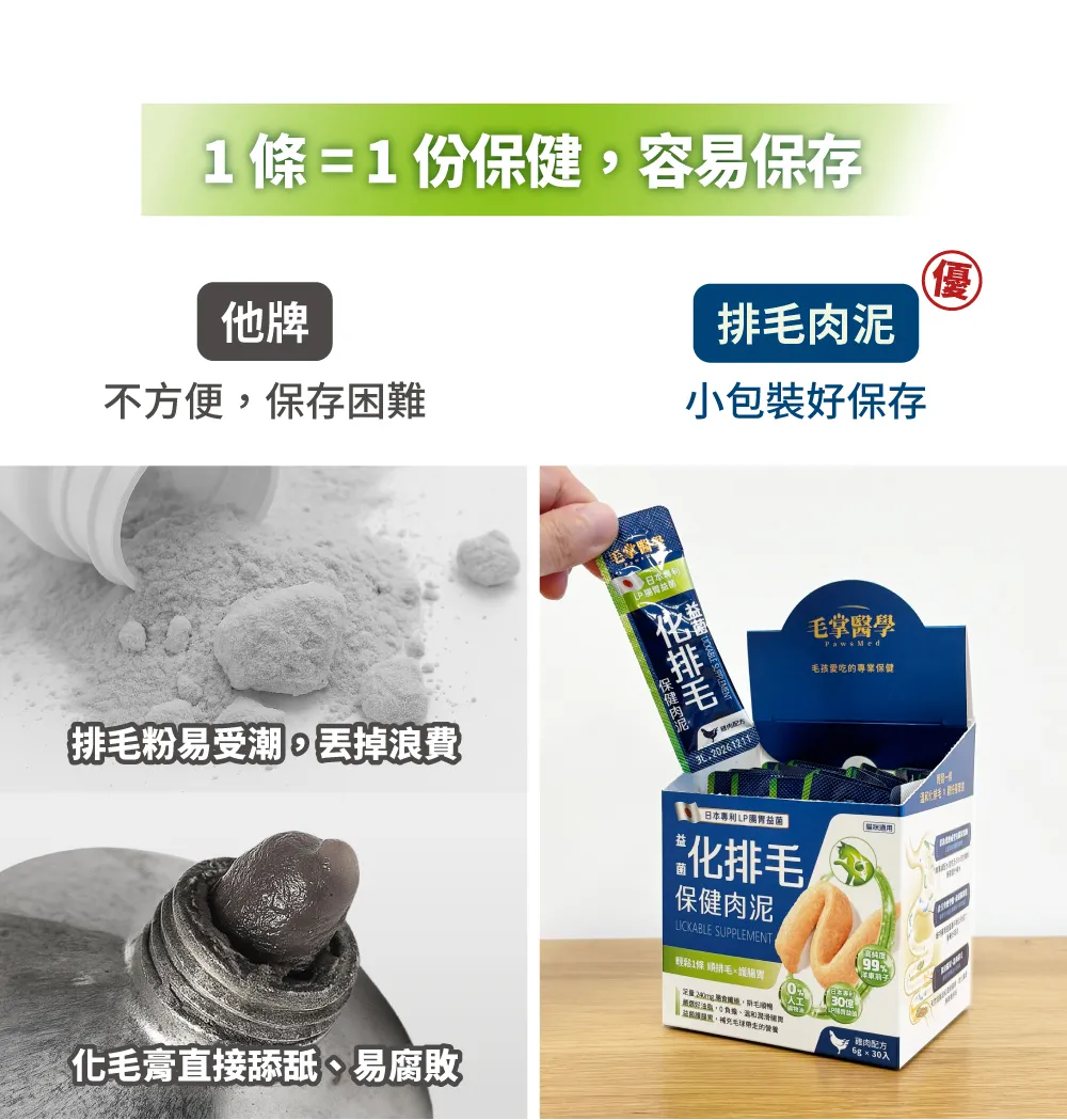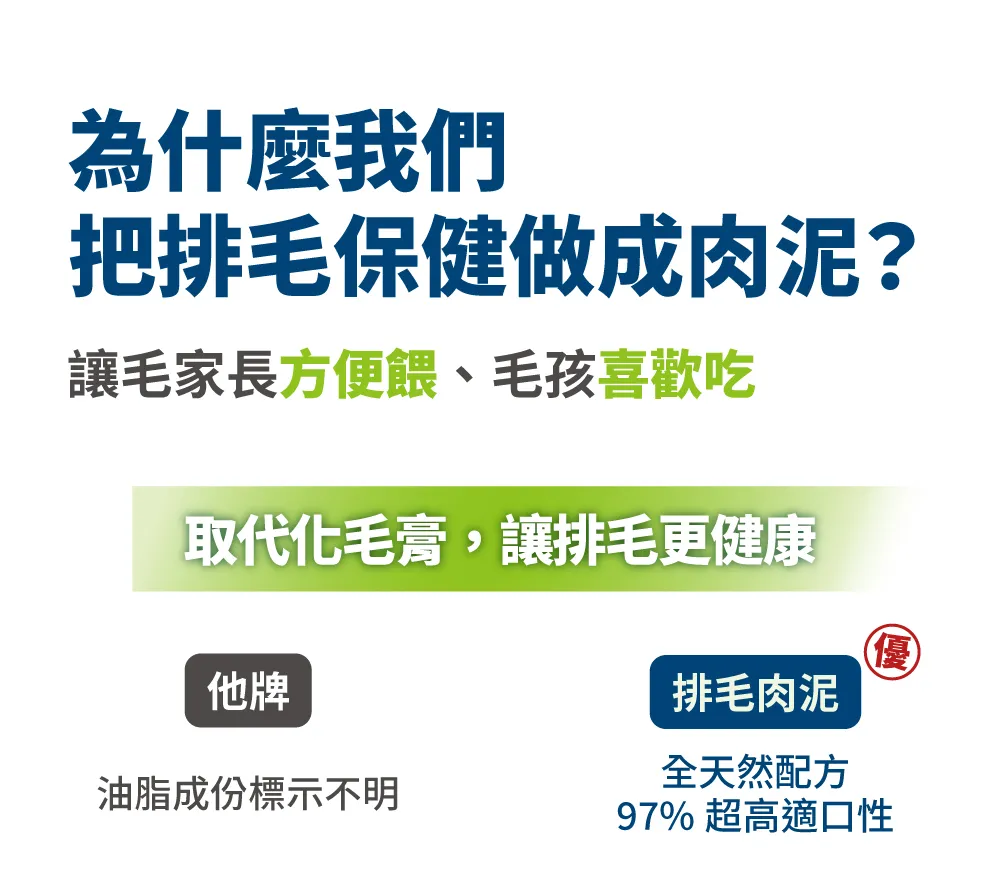 化毛膏普遍含有礦物油和添加劑,保健肉泥無添加礦物油、任何加工品,且保有化毛膏好餵的性質。