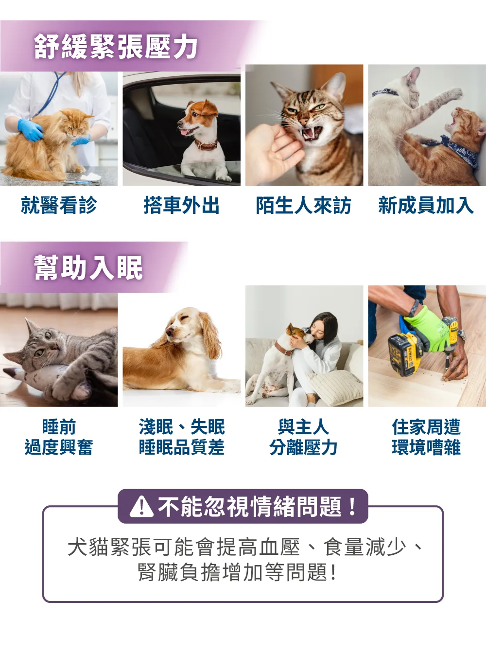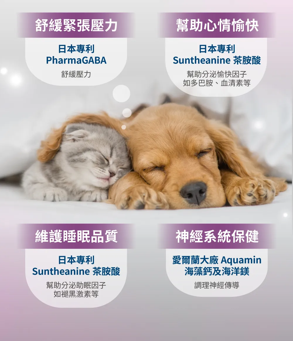 當毛孩緊張或焦慮時,如外出就醫、環境嘈雜、新成員加入等,都可供毛孩食用!此外,也適用於晚上容易興奮的毛孩,幫助它們入睡,也能讓主人睡個好眠!