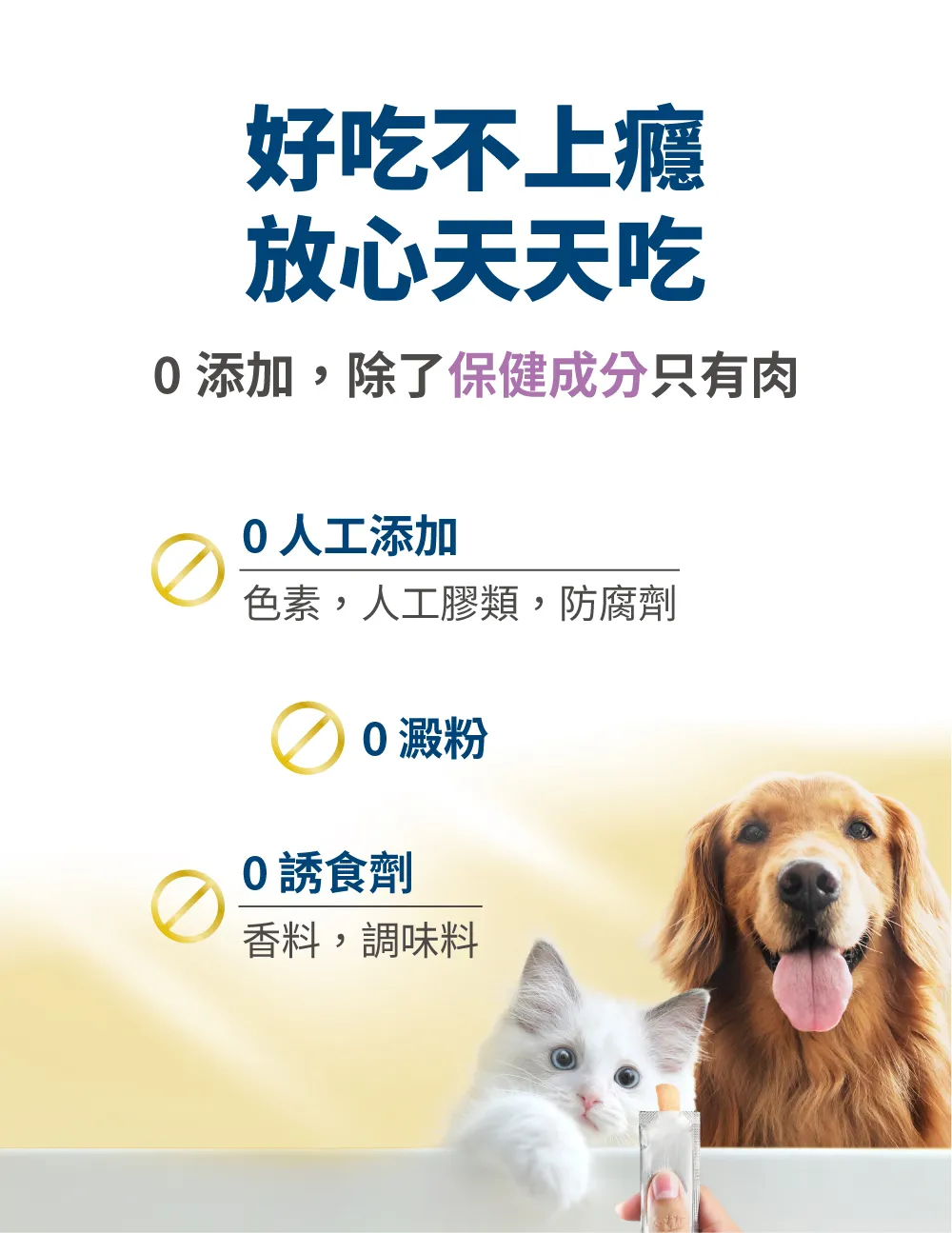 保健肉泥保證不添加任何加工食品,絕不含防腐劑、誘食劑、香精、人工色素等,對毛孩有害的添加物。肉泥嗜口性來自長達2年的技術開發,透過天然水解、選用純肉、高速研磨等高端技術,結合寵物嗜口性研究,才有辦法製成符合毛孩習性、愛吃的風味。
