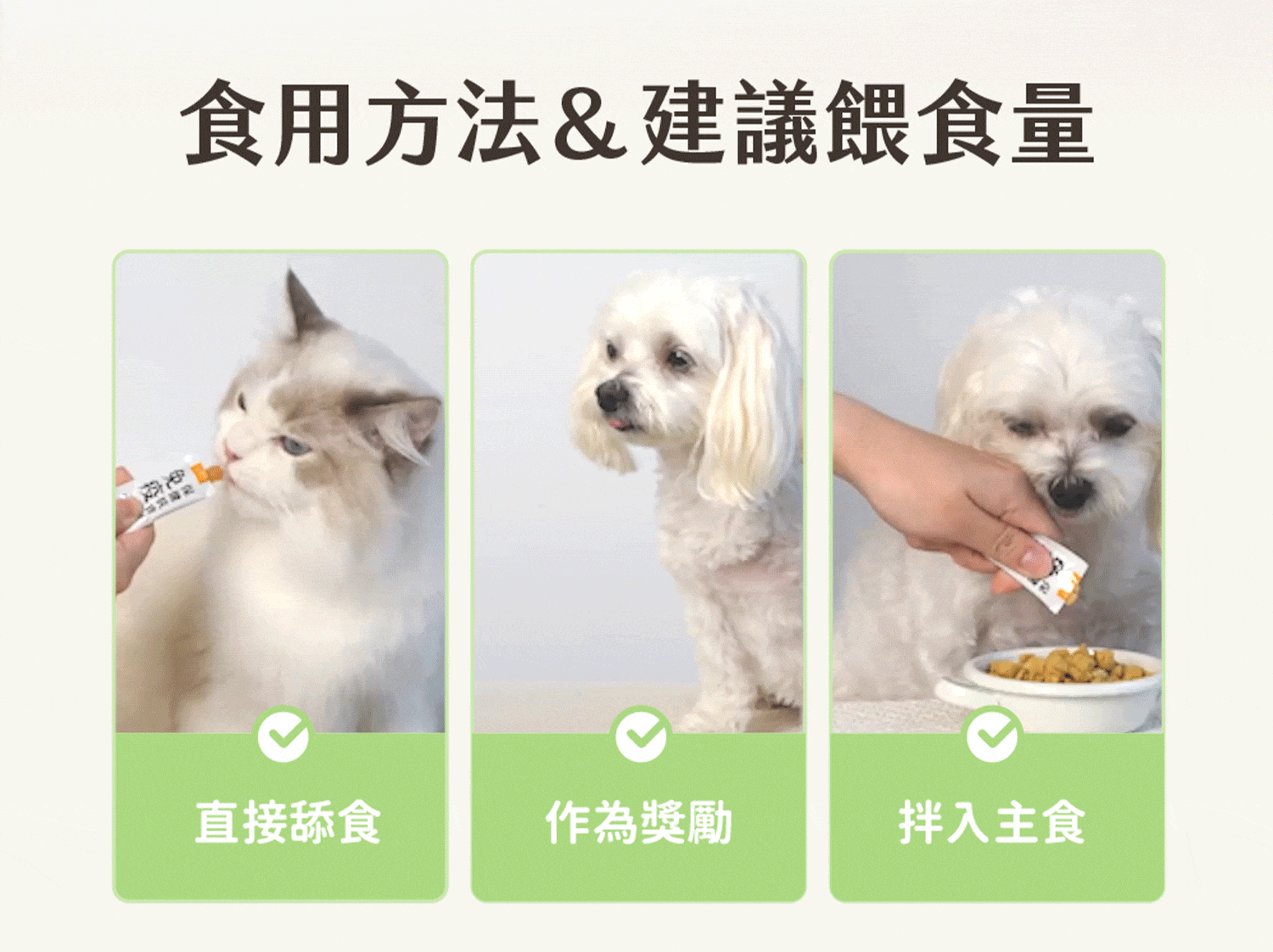 建議依照每日建議餵食量補充。若有額外獎勵或加強保養需求,也可以在原建議量的基礎上多餵一條。