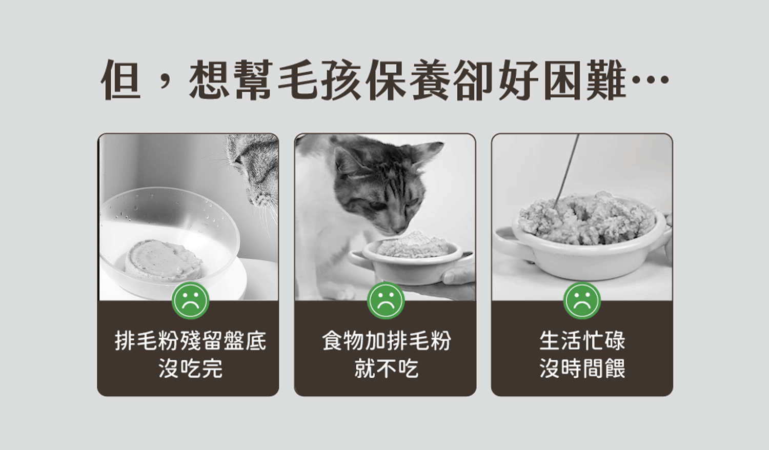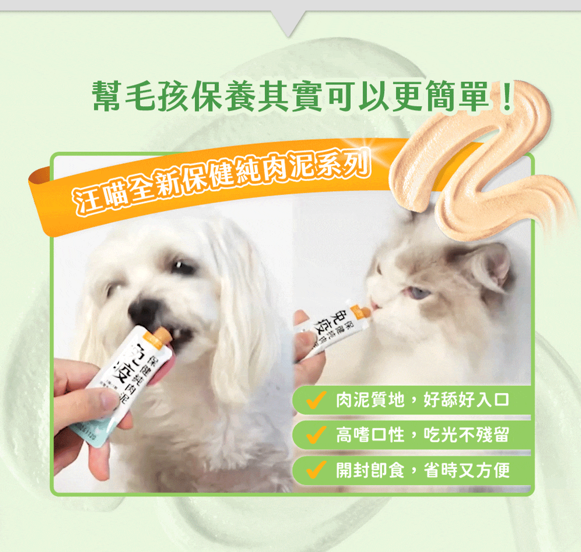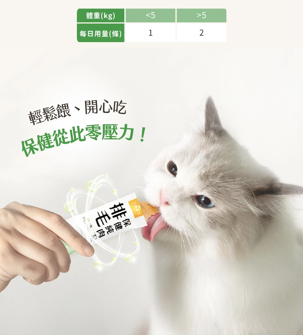 A:可以!保健肉泥設計為「可單獨使用,也能搭配其他保健品」,特別適合忙碌、外出或無法拌粉時靈活補充。若已經有吃排毛相關保健品,每日最多餵一條保健肉泥作為加強即可,不建議過量。