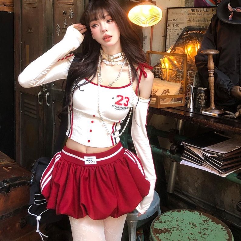 上衣非常好搭 下身可以配紅色花苞裙 或者自己另外購買紅色工裝褲來搭配 都很好看!