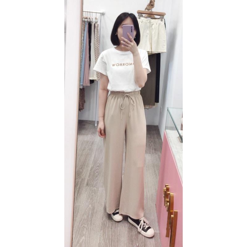 材質滑面舒適 鬆緊腰圍 可用綁帶做調整 無口袋 稍有挺度 穿起來修飾身型 微落地 超顯腿長🥰 腰28-47 臀48 大腿29 褲管寬29 長101cm Model:163/46 剛好 腰63 臀88 大腿52cm 📍搭配(賣場可直接搜尋編號🔍) (A168)韓-雙層花邊造型雪紡上衣-3色 (A182) Tomorrow立體英字泡棉感短袖上衣-3色
