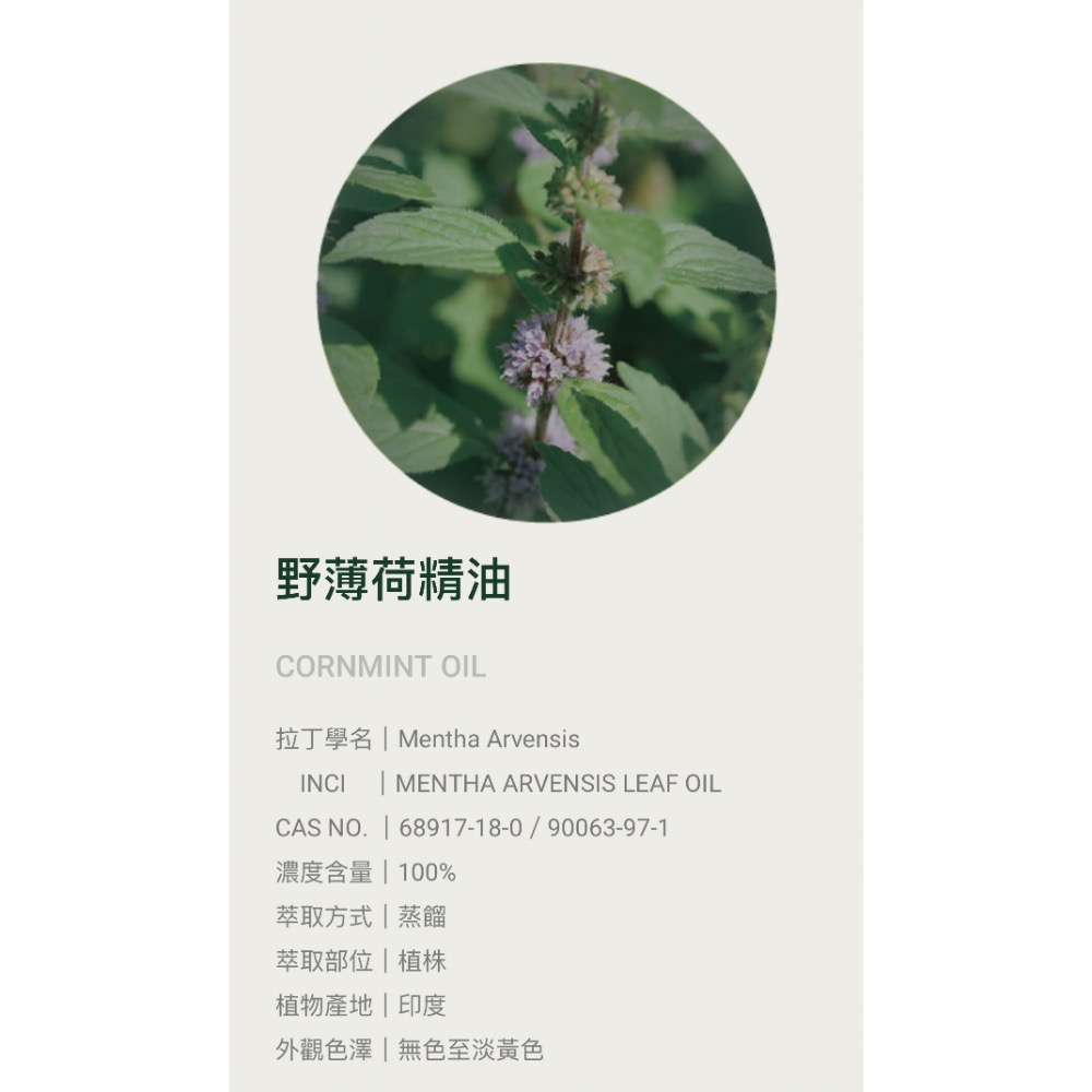 野薄荷精油/玉米薄荷精油/日本薄荷精油(Cornmint/Field Mint/Japanese Mint):學名為Mentha arvensis,薄荷醇含量最高的薄荷品種,原油可高達 72%以上。由於日本曾經是世界最大產地,所以又稱之為日本薄荷。