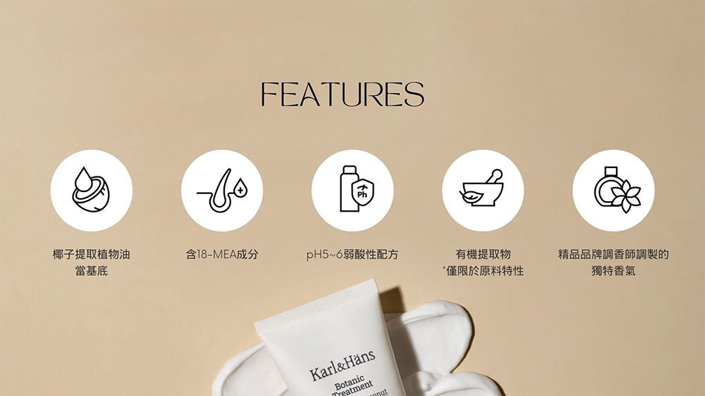 為pH值5-6弱酸性配方。添加頭髮表面重要脂質成分18-MEA維護髮絲柔順,並使用不刺激頭皮的植物基底。具有 Karl&Hans 的特殊獨特香味:擁有柔和椰子、麝香香草和香脂的香味,帶來平靜的餘韻。