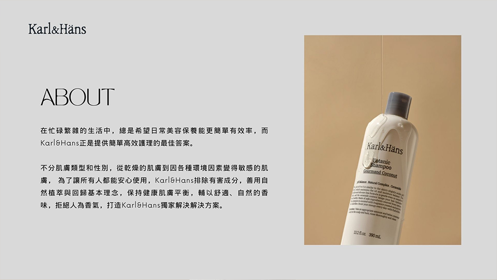 為pH值5-6弱酸性配方。以神經醯胺保持頭皮健康,並運用椰子萃取的植物基底平衡頭皮皮脂和水分。具有Karl & Hans 的特殊獨特香味:擁有柔和椰子、麝香香草和香脂的香味,帶來平靜的餘韻。
