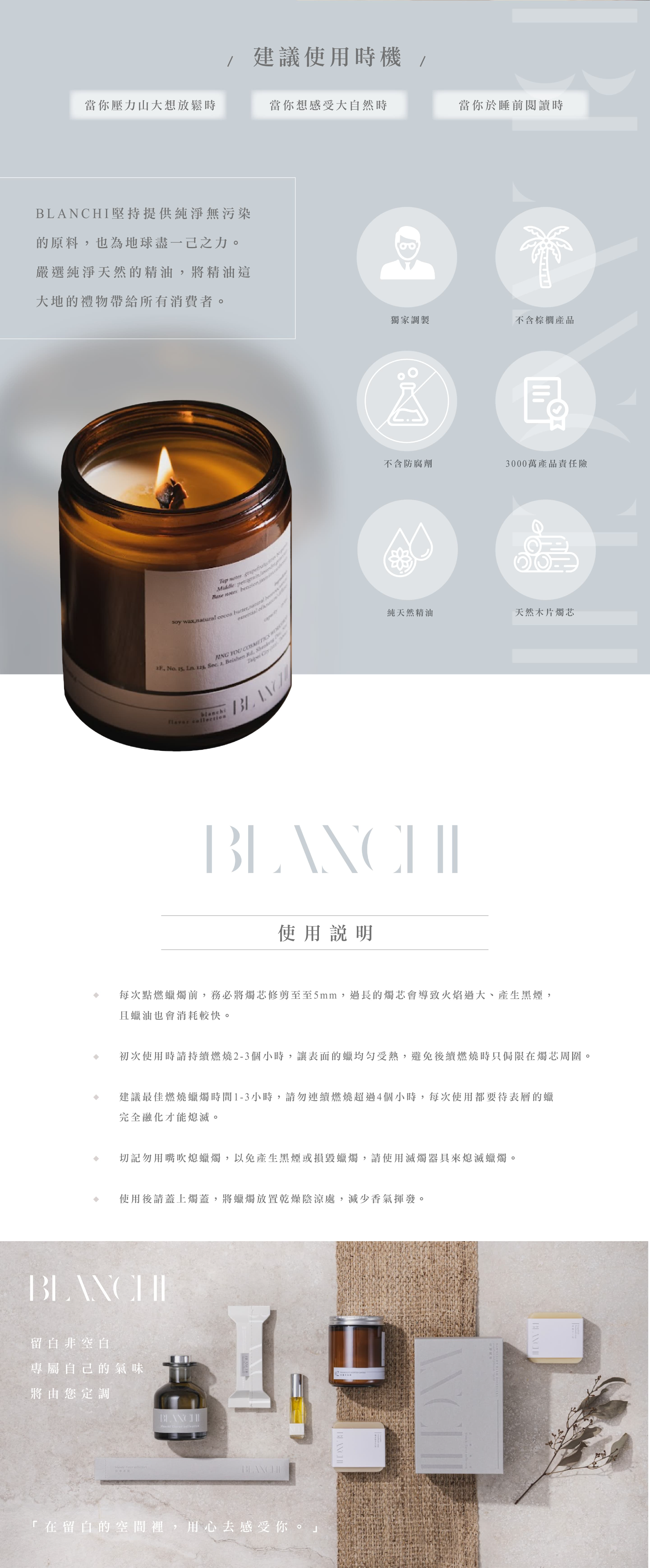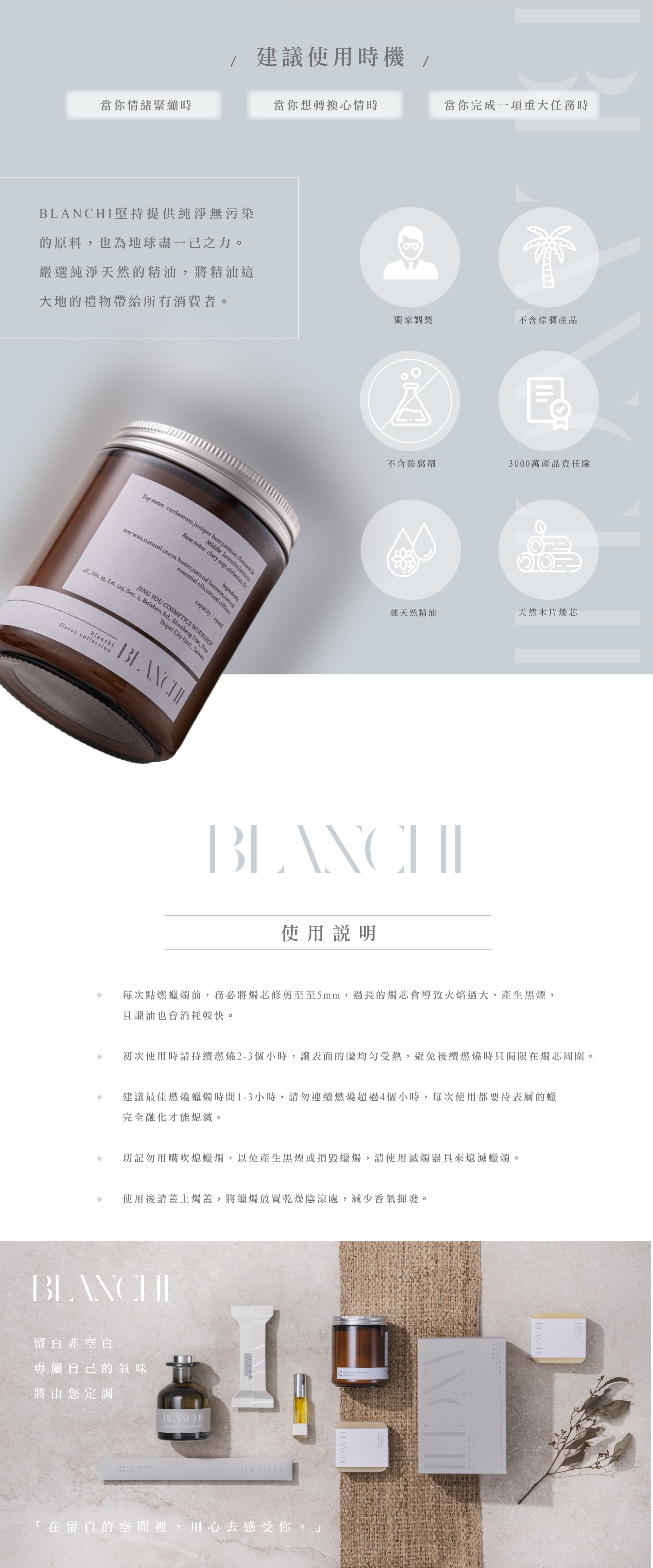 成分|天然精油(豆蔻、杜松漿果、羅馬洋甘菊、薰衣草、安息香、快樂鼠尾草、西伯利亞冷杉)、天然擴香溶劑、大豆蠟、天然蜂蠟、天然可可脂