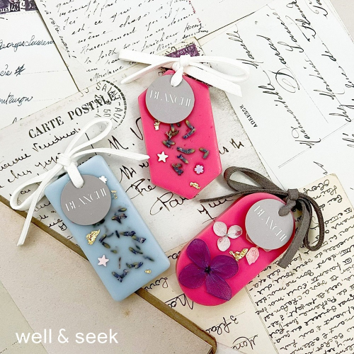 簡易設計,搭配乾燥花裝飾,融入於大豆蠟,主要吊掛於衣櫥或放置於櫃內,藉由擴香享受香氛帶來的愉悅,亦可作為裝飾品。
