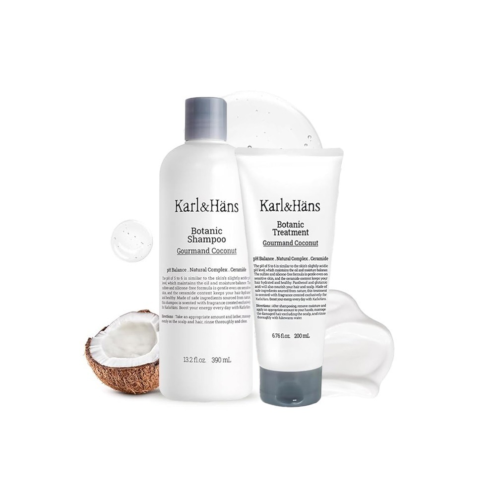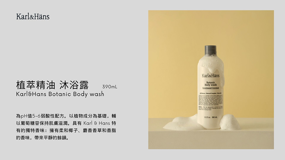 為pH值5-6弱酸性配方。以神經醯胺保持頭皮健康,並運用椰子萃取的植物基底平衡頭皮皮脂和水分。具有Karl & Hans 的特殊獨特香味:擁有柔和椰子、麝香香草和香脂的香味,帶來平靜的餘韻。