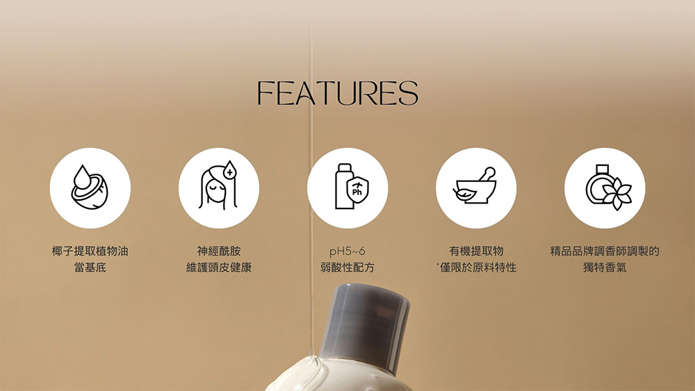 為pH值5-6弱酸性配方。以神經醯胺保持頭皮健康,並運用椰子萃取的植物基底平衡頭皮皮脂和水分。具有Karl & Hans 的特殊獨特香味:擁有柔和椰子、麝香香草和香脂的香味,帶來平靜的餘韻。