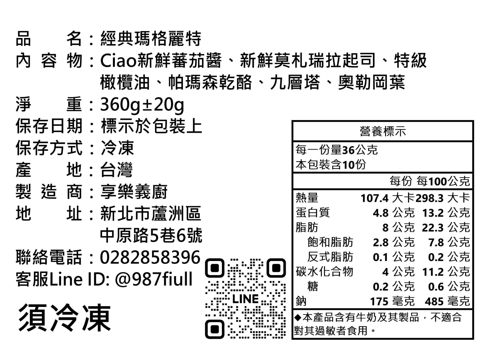 • 特色:採用手工薄餅底,烘焙至金黃酥脆,頂上撒上香草橄欖油,呈現出紅、白、綠的義大利國旗色彩,簡單卻不平凡,讓每一口都充滿義大利的傳統風味。