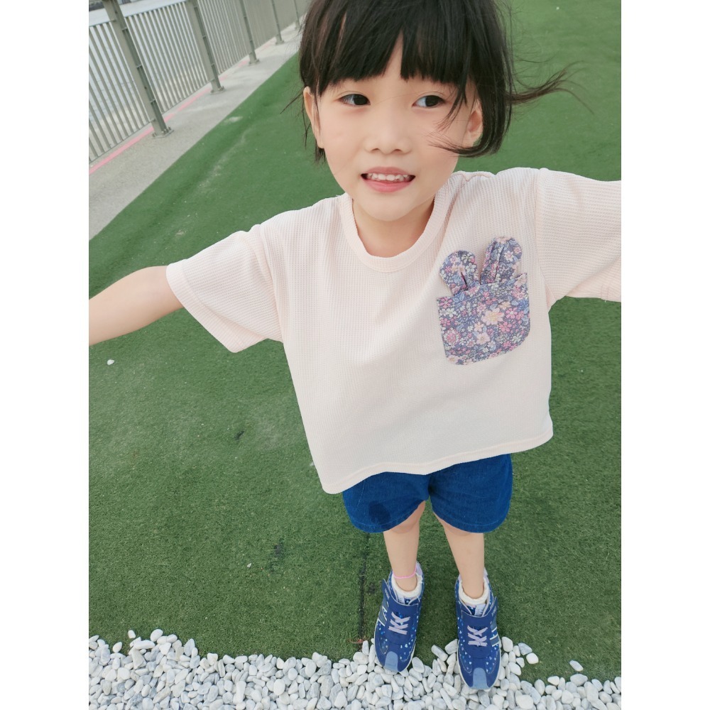 Rakkimore 童裝 日系童裝 韓系童裝 小碎花小兔子口袋-粉色 華夫格透氣好穿 尺寸90~130公分