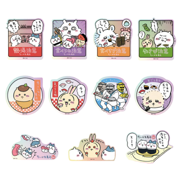 快來收集這套吉伊卡哇壽司系列閃光貼紙,讓小八、烏薩奇、小桃等角色的壽司造型閃耀你的生活吧!