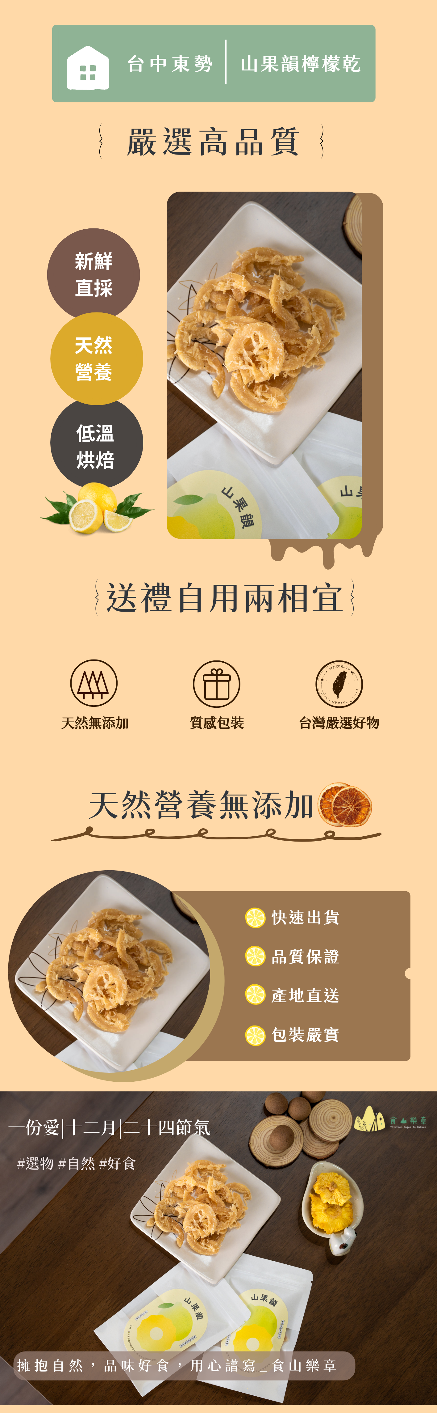 嚴選東勢新鮮檸檬,低溫慢烘,保留果皮清香與果肉微酸甘甜的純粹風味。無添加糖與防腐劑,天然回甘,每一片都是陽光與山林的醇厚韻味,適合沖泡、搭配料理或直接享用。