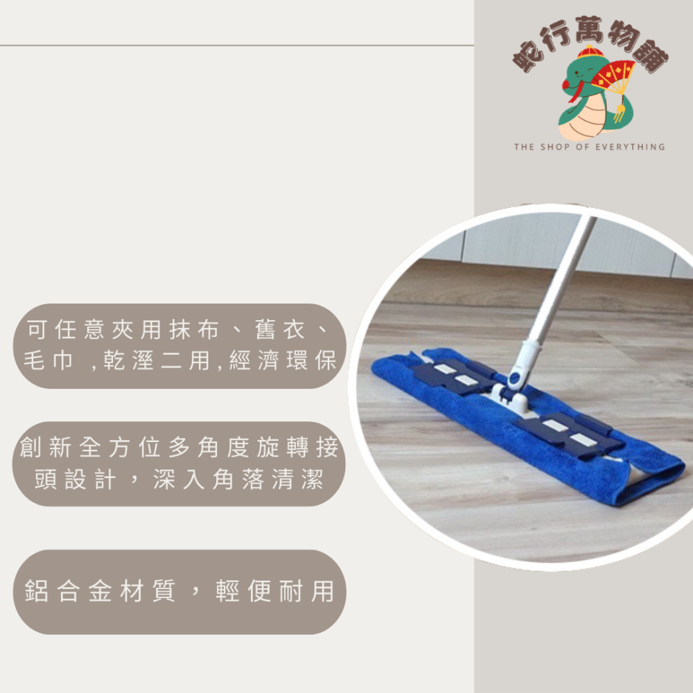 * 可任意夾用抹布、舊衣、毛巾、及餐巾紙 ,乾溼二用,經濟環保,拖地更輕鬆
