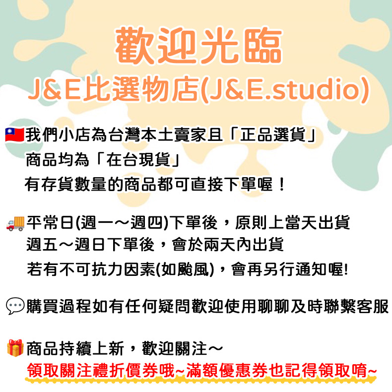 歡迎光臨J&E比選物店(J&E.studio)🤍 ————————————————————————— 🇹🇼我們小店為台灣本土賣家且「正品選貨」,商品均為「在台現貨」,有存貨數量的商品都可直接下單喔! 🚚平常日(週一~週四)下單後,原則上當天出貨,週五~週日下單後,會於兩天內出貨,若有不可抗力因素(如颱風),會再另行通知喔~ 💬購買過程如有任何疑問歡迎使用聊聊及時聯繫客服~ 🎁商品持續上新,歡迎關注 ————————————————————————— 🛒 購物須知(下單即表同意) ⚠️商品若有庫存異常、缺貨等狀況,會另行通知更換款式或退款喔~ ⚠️下單前請務必確認商品款式、顏色、尺寸及取件門市,且下單後還請務必取貨~ ⚠️若您覺得本店有任何需要改進,歡迎您不吝賜教,並使用聊聊告知與溝通,不建議透過評價溝通唷,謝謝🙏 ——————————————————————————