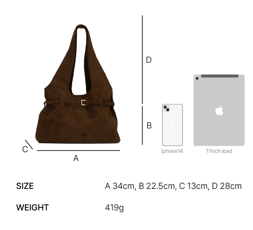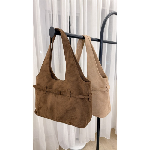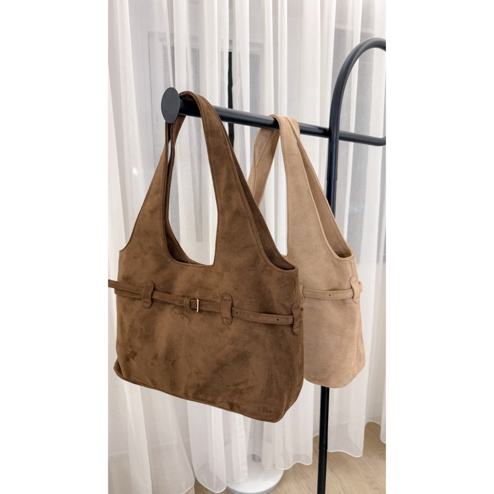商品細節:麂皮質感搭配扣帶細節,容量實用,日常通勤都好搭。