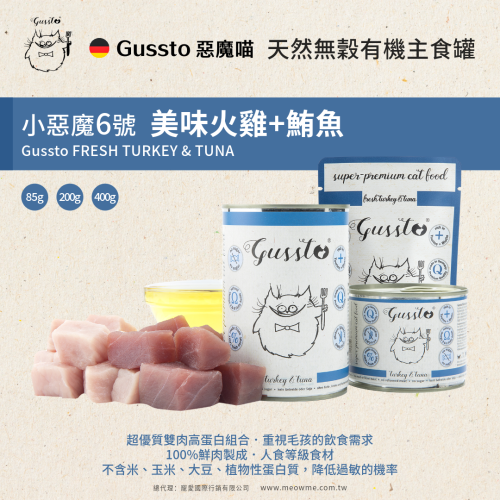 貓奴小舖Maonu Shop🐈 GUSSTO惡魔喵 無穀主食罐【火雞+鮪魚】85g 有機 無膠 全齡貓 德罐 牛磺酸