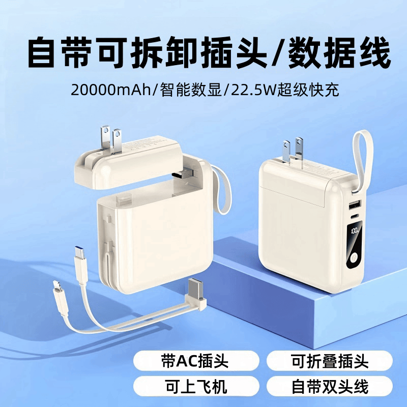 AC插頭充電寶22.5W超級快充大容量20000毫安自帶線三合一移動電源