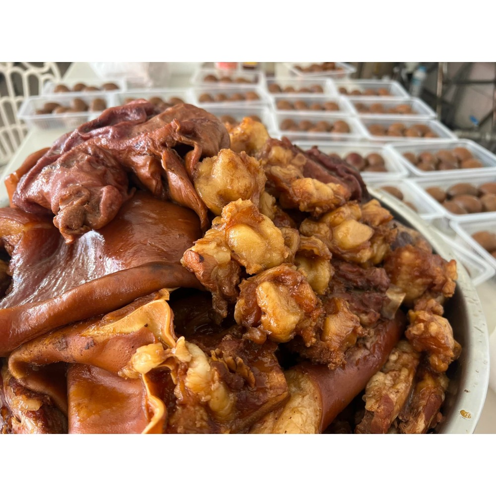 一盒 700g+-20g,使用產地台灣的溫體豬,食材由豬尾(口感Q彈有嚼勁,含豐富蛋白質、膠原蛋白),豬耳朵(豬耳很有營養,口感非常好,吃到嘴裡是又軟糯又Q脆,味道鮮香不膩,且富含膠質。),豬心(含有蛋白質、脂肪、鈣、磷、鐵、維生素B1、維生素B2、維生素c以及煙酸等,口感微Q帶脆,完全沒有腥味),虎掌(豬隻的「後腿肌腱」,一頭豬僅有兩塊的精華部位. 蘊含豐富的膠質和膠原蛋白,口感軟糯Q彈. ),肝連(肝連肉是豬的橫隔膜和橫膈肌,也稱「隔間肉」)混搭,材料每盒會有些許不同,但重量相近,用薑、蒜頭、酒、醬油、辣椒(增加香氣,不辣口)、香油滷製,滿滿膠原蛋白。