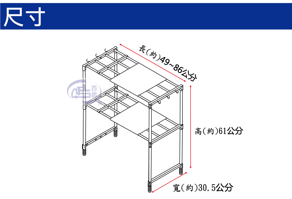 數量:支撐桿x4、層架x2、銜接桿x2、掛勾x6、PP隔板x2/組