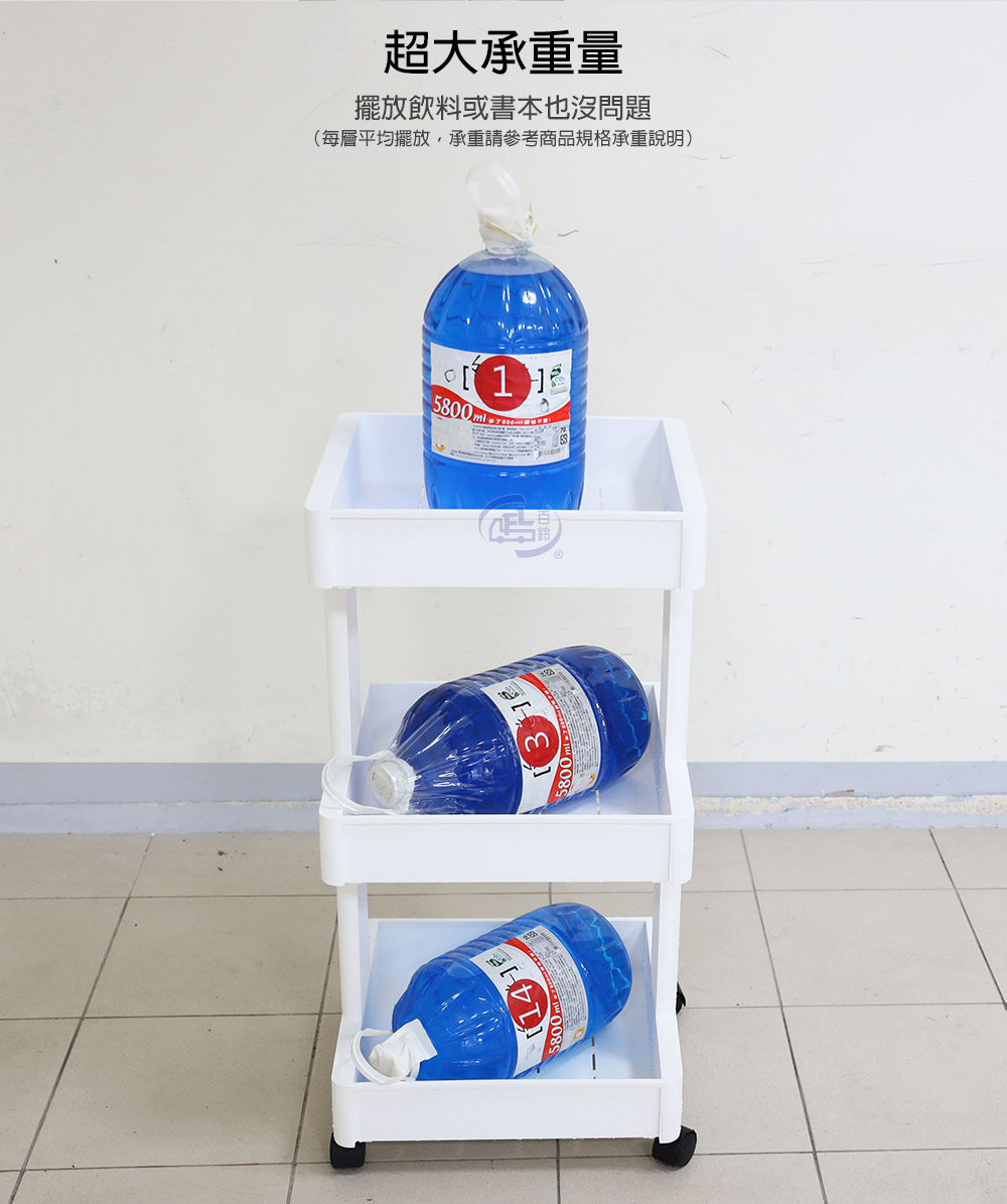 承重:第一層(最上層)承重4公斤、第二層承重6公斤、第三層(最下層)承重10公斤/總承重20公斤(請每層平均擺放)