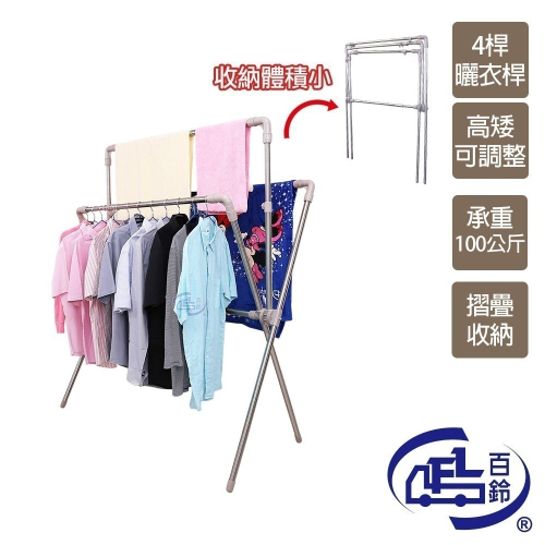 【百鈴】衣立不倒四桿X型可升降伸縮曬衣架(曬衣架/掛衣架/室內衣架/移動架/棉被架/毛巾架)
