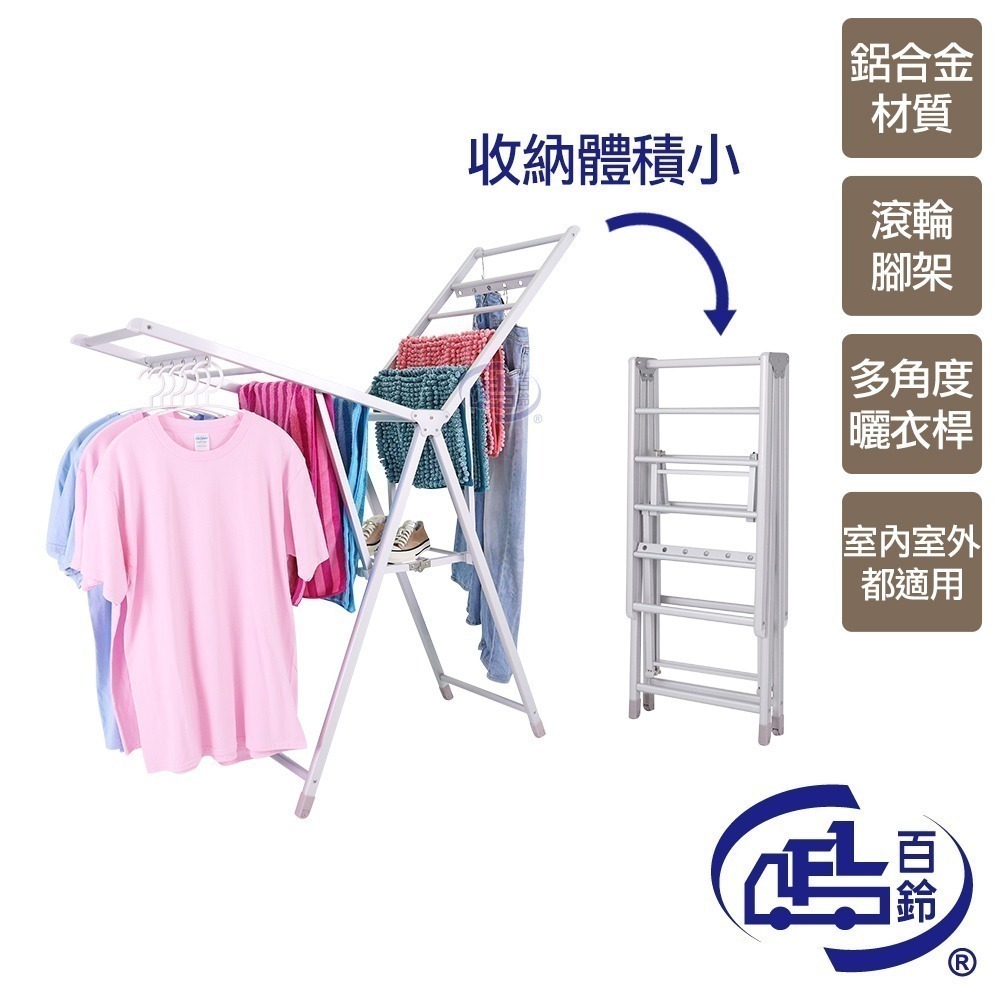 【百鈴】衣立不倒鋁合金翼型折疊帶輪曬衣架(曬衣架/掛衣架/室內衣架/移動架/棉被架/毛巾架)