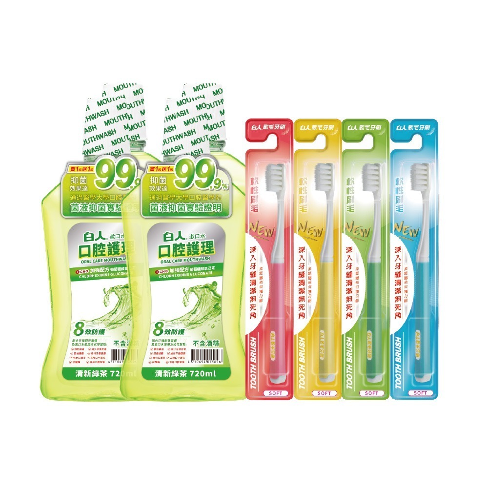 【白人】口腔護理綠茶漱口水720mlX4入+白人牙刷X4支(新舊包裝/牙刷款式顏色隨機)