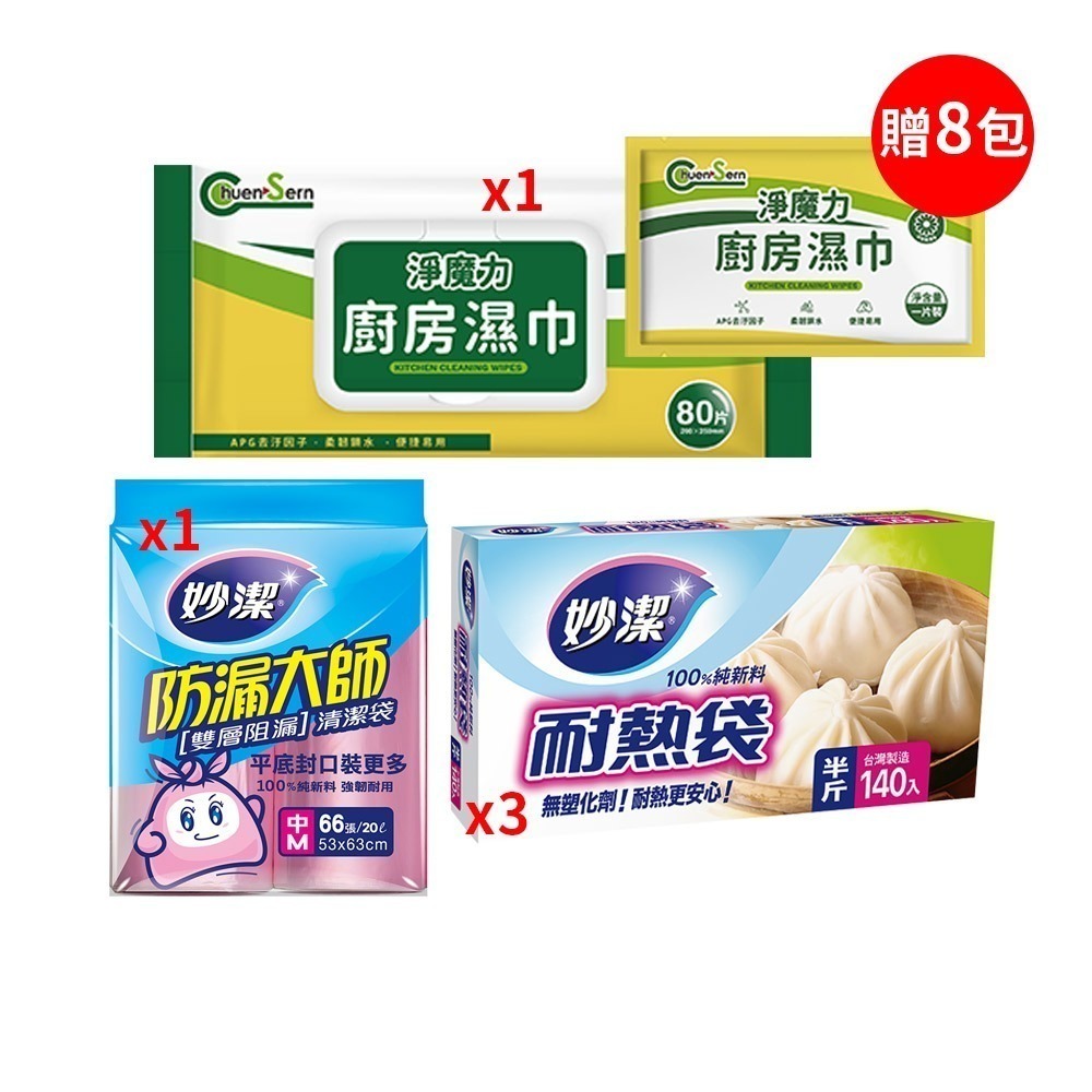 【限時購】中秋,淨魔力廚房濕巾80抽1包(贈試用包8包)+妙潔防漏大師清潔袋中1袋+耐熱袋半斤3盒