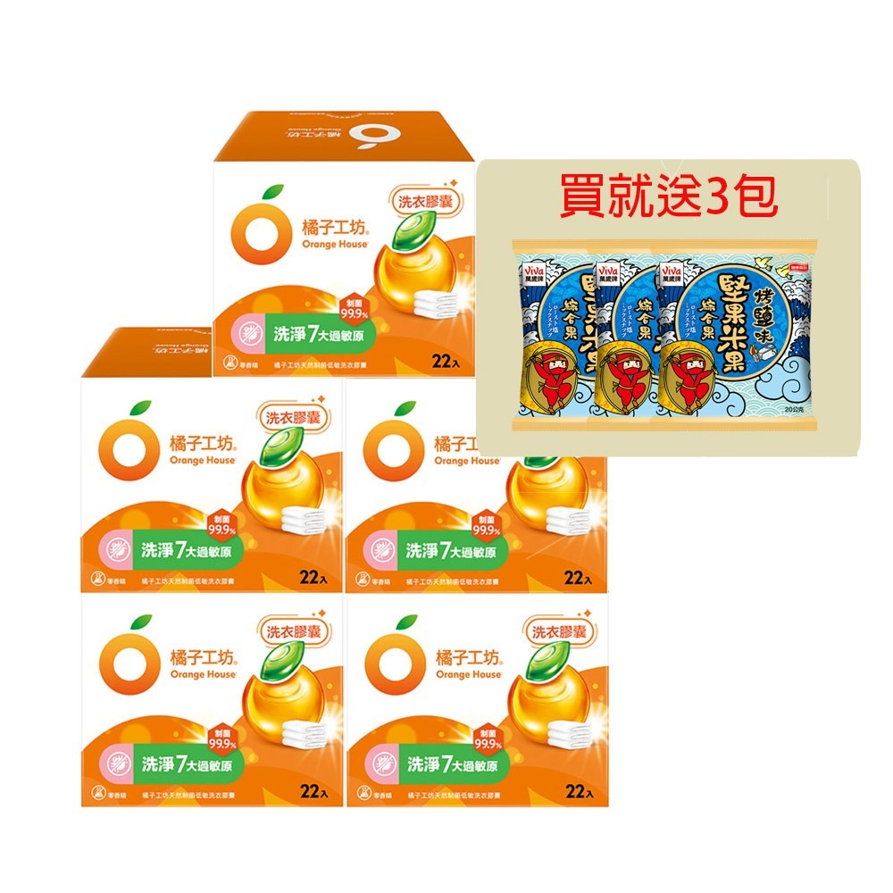 宅配/超取賣場】贈萬歲牌綜合果20gx3包 橘子工坊 天然制菌洗衣膠囊/洗衣球(22顆/盒)x5盒,共110顆(低敏)