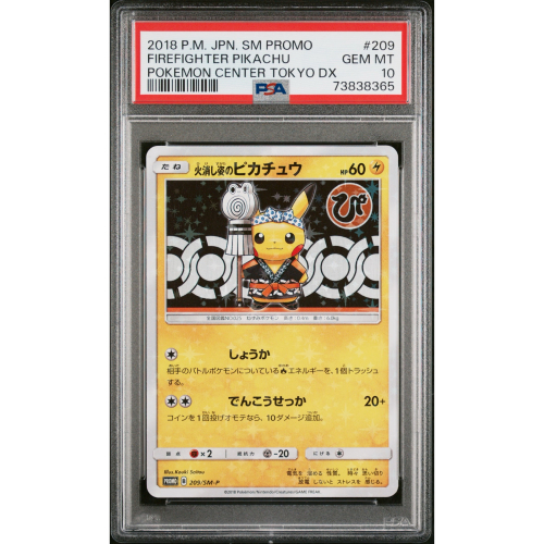• 商品簡介:這張消防皮卡丘卡是2018年3月14日東京DX寶可夢中心開幕的限定紀念品,僅在「Pokémon Center Tokyo DX Special Box」中發行,數量極少,屬於SM-P促銷系列。由畫師 Kouki Saitou 繪製,設計靈感源自江戶時代的「火消」(hikeshi)消防員,皮卡丘身著傳統消防服,手持波利渦龍造型的「纏」(matoi)旗幟,融合復古與可愛元素象徵東京文化多樣性。