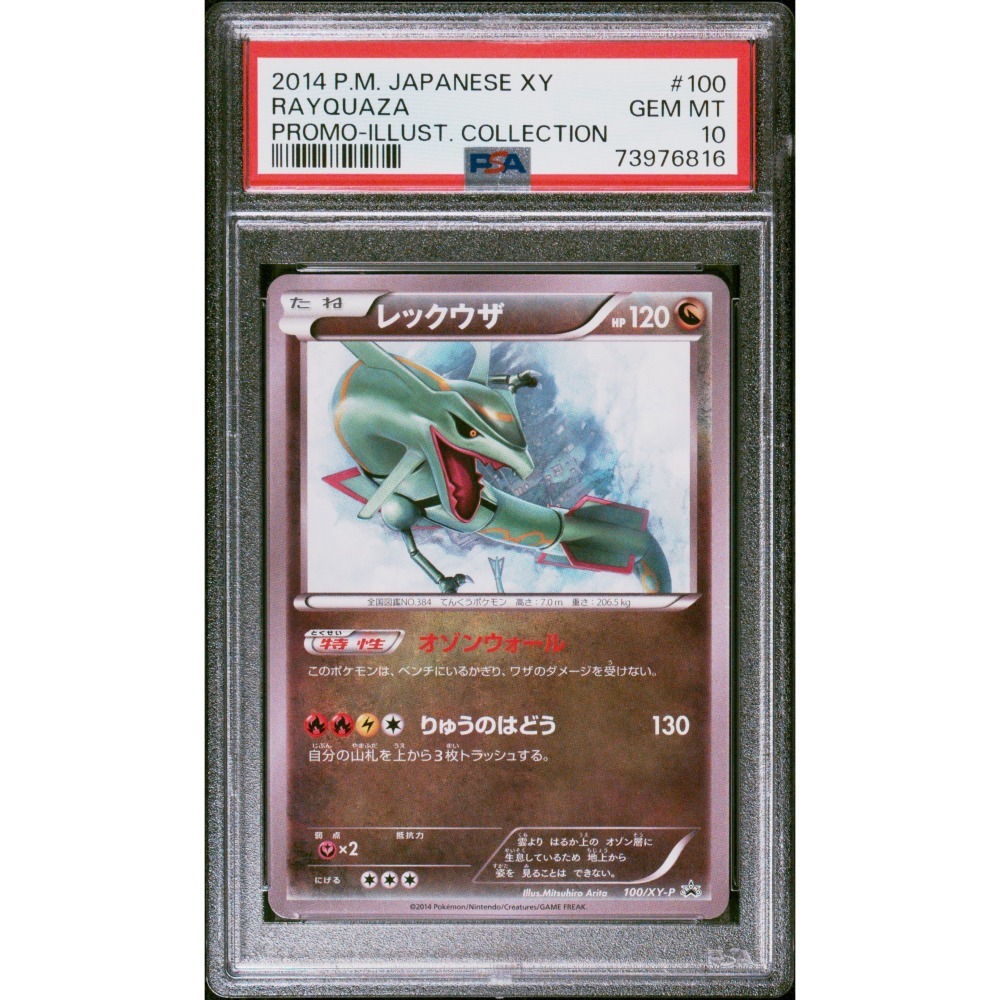 • 商品簡介:Illustration Collection 是2014年日本限定紀念冊系列,於2014年7月發行,收錄多位知名畫師的原創插畫卡,僅透過購買冊子獲得,標誌《寶可夢 X/Y》時代的藝術轉型。烈空坐 (Rayquaza)作為第三世代龍/飛行系傳說寶可夢,以其「破壞之龍」形態聞名,在遊戲中以龍卷風與極巨化能力主宰天空。這張 #100/XY-P 促銷卡由畫師 Mitsuhiro Arita 繪製,烈空坐以翱翔天際的霸氣姿態登場,背景融合雲海與能量漩渦,畫風經典而充滿動感,是 Illustration Collection 的高人氣珍品,兼具藝術收藏與懷舊價值。