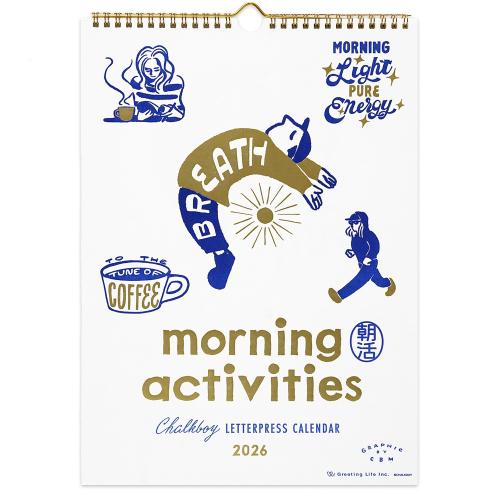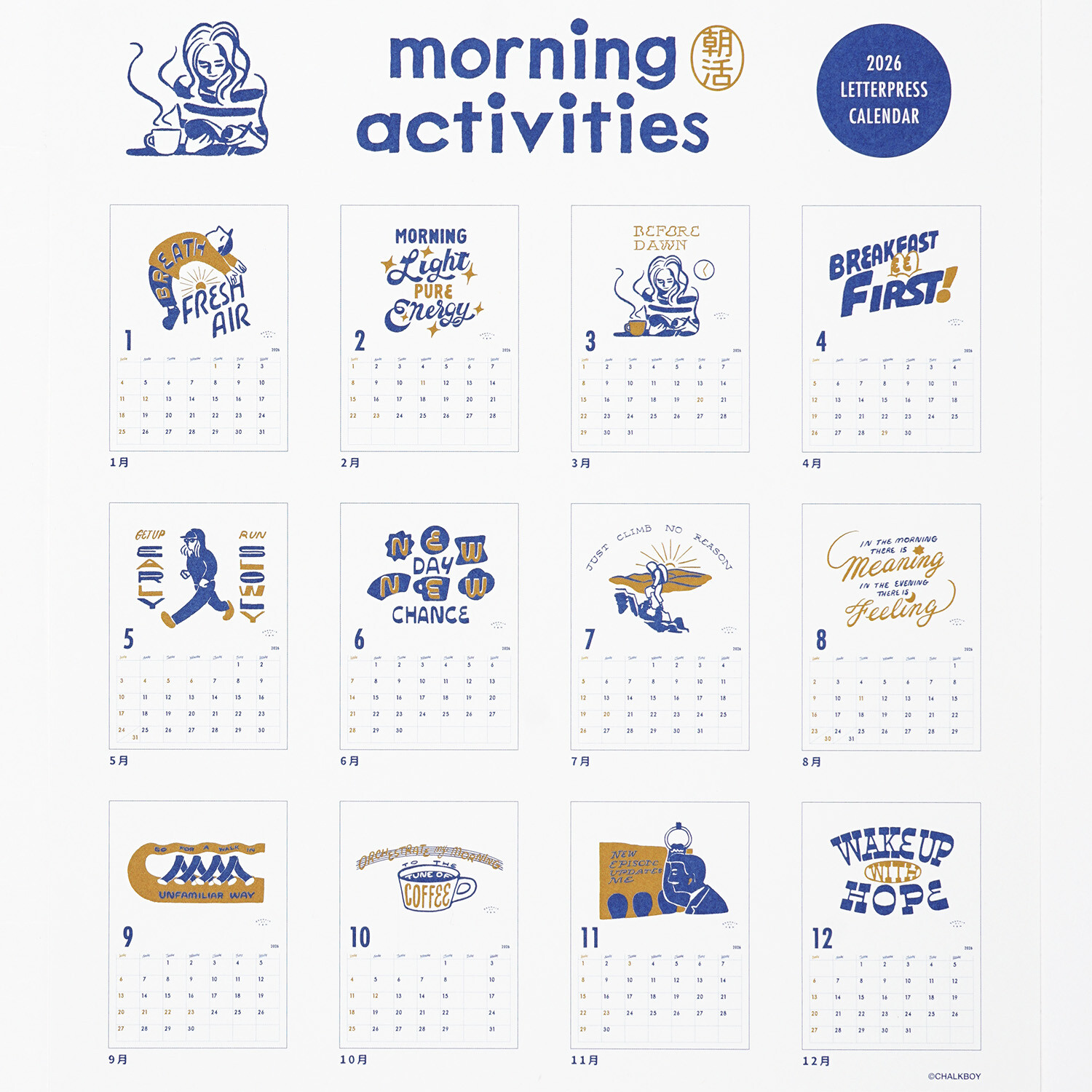 豪華凸版印刷日曆,採用 Chalk Boy 的原創插圖,每個月都貼上金箔。