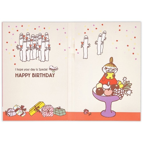 雙折音樂盒卡,打開時會播放旋律。這是一張可愛的生日卡,以 My 和 Nyoronyoro 為主題,充滿派對氣氛。