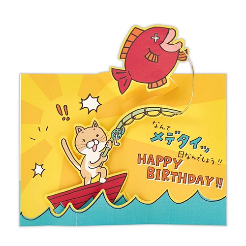 一張可愛幽默的生日卡,描繪了一隻動態的貓在釣魚。