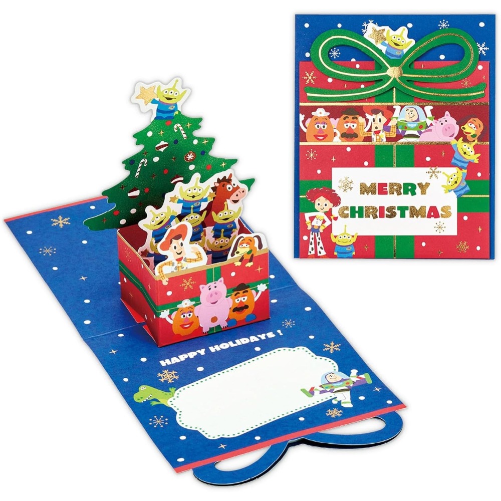 這款可愛的設計展現了玩具總動員的朋友們從聖誕禮盒中探出頭來。打開卡片,即可看到聖誕樹和各種角色。