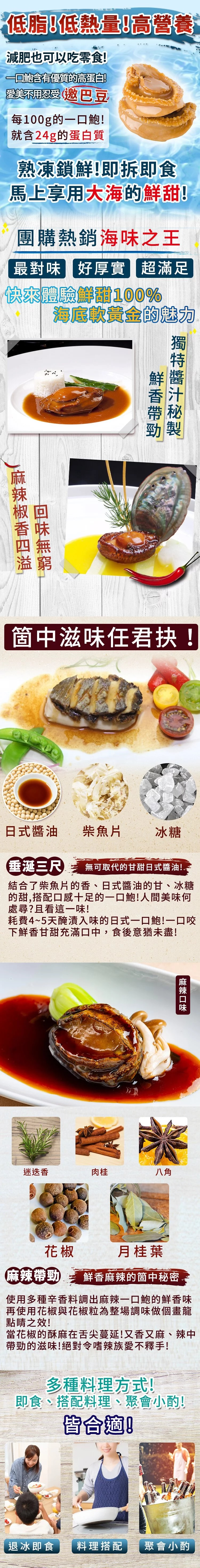 (麻辣:鮑魚、水、雞粉(鹽、麥芽糊精、雞肉精粉、糖、棕櫚油、香料、L-麩酸鈉、胺基乙酸,DL-胺基丙酸,5'-次黃嘌呤核苷磷酸二鈉,5-鳥嘌呤核苷酸二鈉、醬油(水、非基因改造脫脂黃豆、小麥、轉化液糖、苯甲酸鈉、膠糖色素、DL-蘋果酸、酵母抽取物、紅麴色素、甜味劑)、冰糖、甘草、八角、花椒、沙薑、草菓、丁香、月桂葉、肉桂、辣油(辣椒粉、花椒粒、八角、白豆蔻、丁香、蔥、薑、芹菜、紫草、花椒粉、沙拉油))
