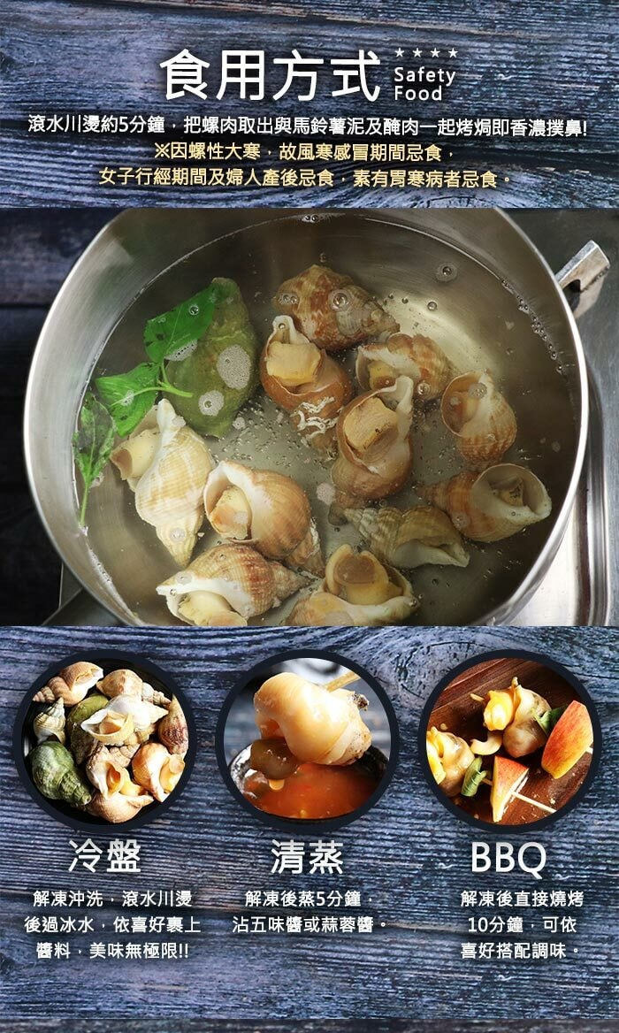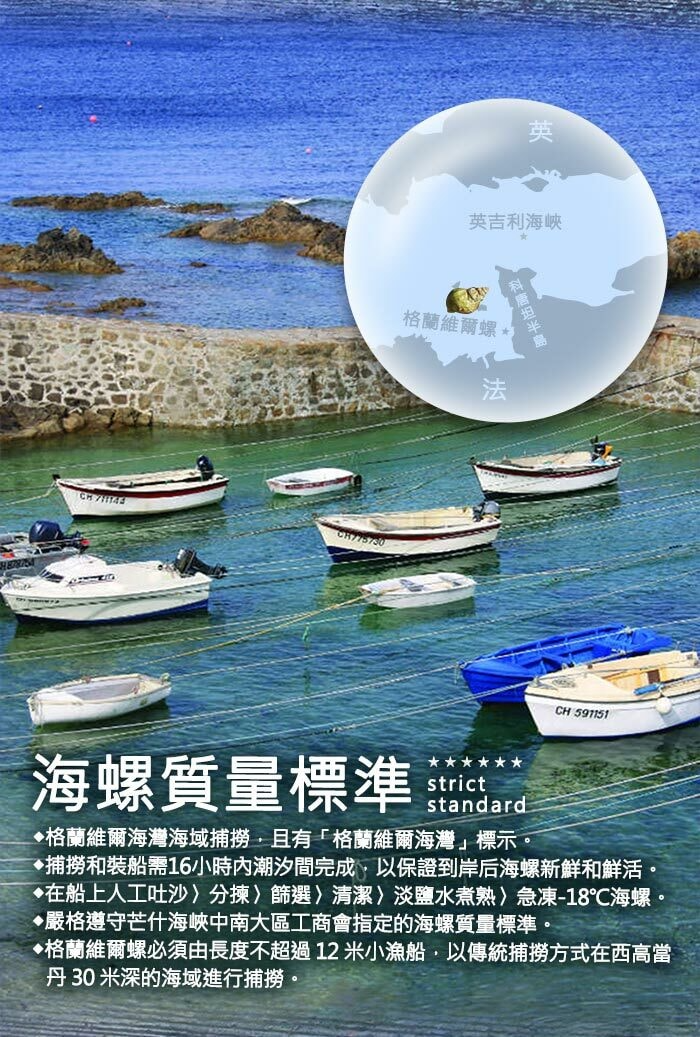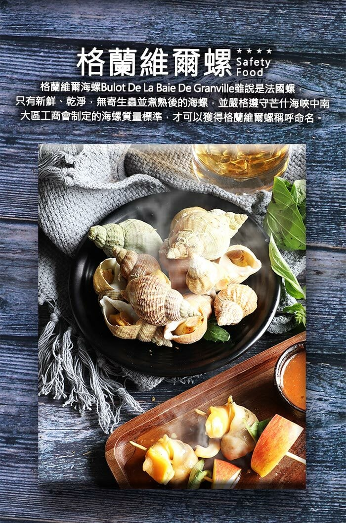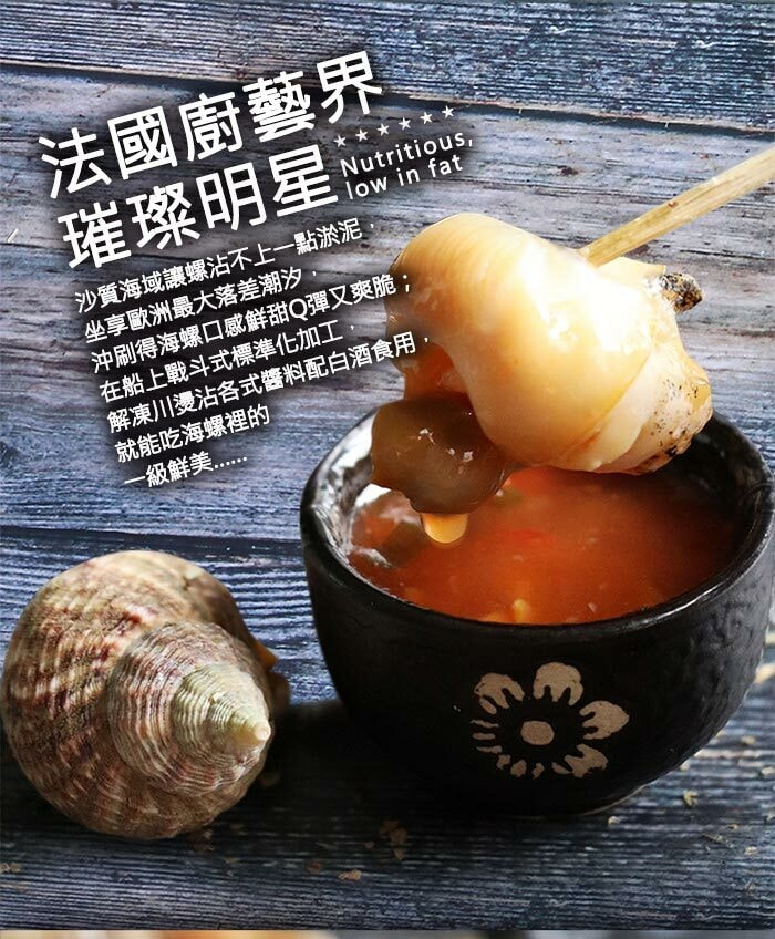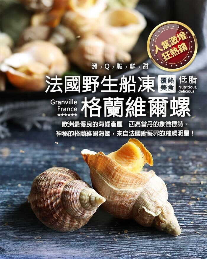 1.商品品名:法國野生船凍格蘭維爾海螺4包(300g/約15顆)-附獨家沾醬