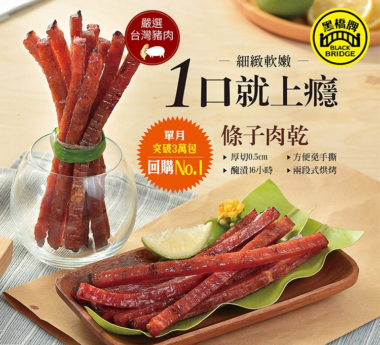 1.商品組合/規格:【黑橋牌】原味/黑豬厚燒/香麻條子肉乾單條包裝3件組