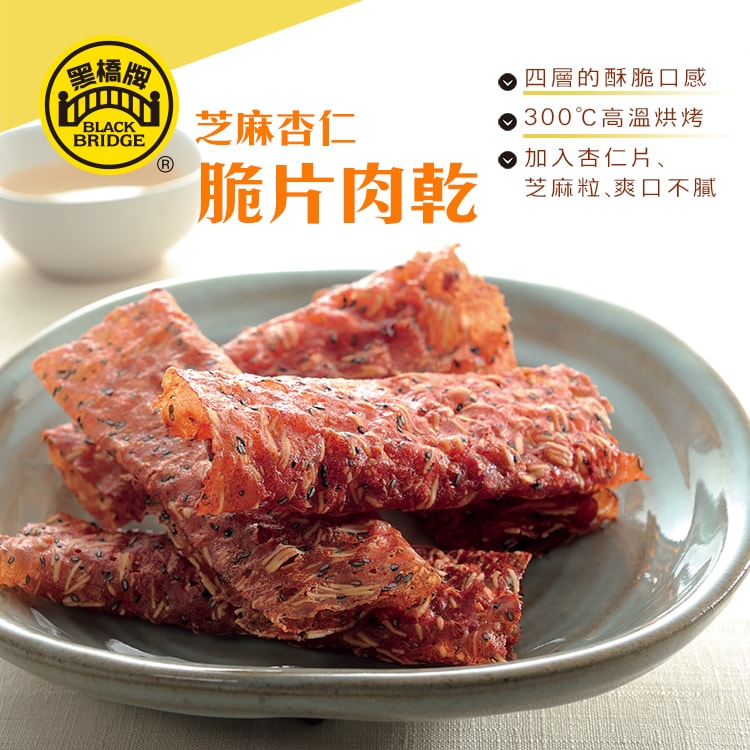 芝麻杏仁脆片肉乾-豬肉、糖、杏仁片、黑芝麻、醬油(非基因改造大豆、小麥、蔗糖轉化液糖、酵母粉)、鹽、黑麻油
